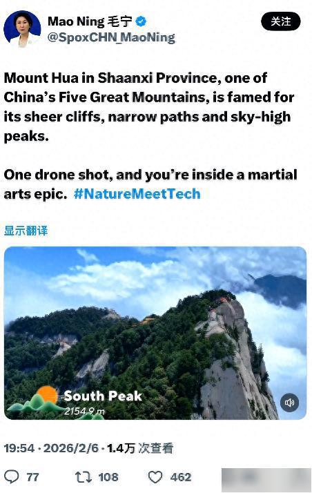 华山又一次在海外社交平台火“出圈”了!2月6日,外交部发言人毛宁在外网分享了一段华山视频,让西岳奇险之美走向世界。