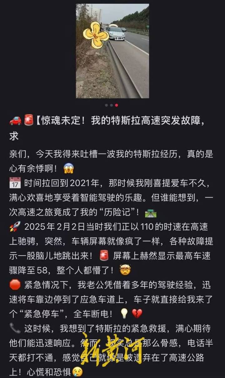 陈女士的经历并非孤例。记者注意到,另一位特斯拉车主王女士有一次极为相似的经历。王女士开的是2021款Model3。2025年2月,她以110公里左右的时速在高速上行驶时,车辆突然出现异常。“屏幕像是失控了一样乱跳”,她说。随后,系统把最高车速限制在了58公里/小时,紧接着,全车断电。