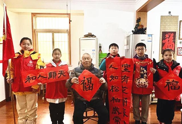 队员们带着满是墨香的春联,跟随社居委志愿者走进社区老战士、老党员家中,将这份红红火火的祝福亲手送达。当孩子们将精心书写的春联和“福”字送到爷爷们手中时,这一刻,传统的年味、真诚的敬意与温暖的关怀,在这份特殊的“新年礼物”传递中默默交融。红纸黑字,书写的是千年文化;小手传爱,温暖的是冬日人心。
