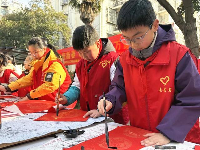 活动现场红纸铺展、翰墨飘香。小小志愿者们凝神聚气,挥毫落笔,横竖撇捺间,“人顺家和万事兴”等一副副寓意吉祥的春联跃然纸上。居民们纷纷驻足欣赏、挑选,不时传来“这字写得真精神!”的称赞声。红纸黑字映着笑脸,墨香与欢笑让年味在冬日的社区里弥漫开来。温暖在笔墨之外继续延伸。