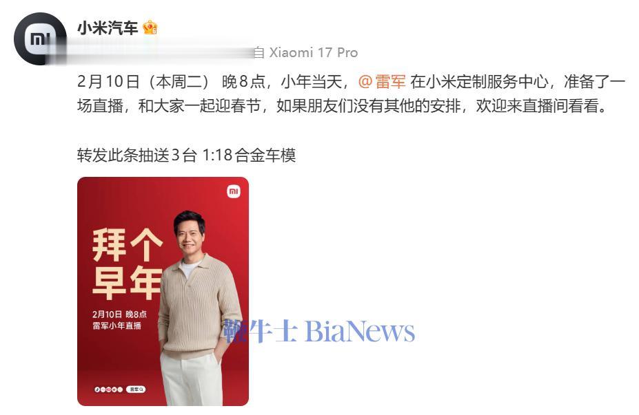2月9日,小米汽车今日宣布,2月10日(本周二)晚8点,小年当天,雷军在小米定制服务中心,准备了一场直播,和大家一起迎春节。