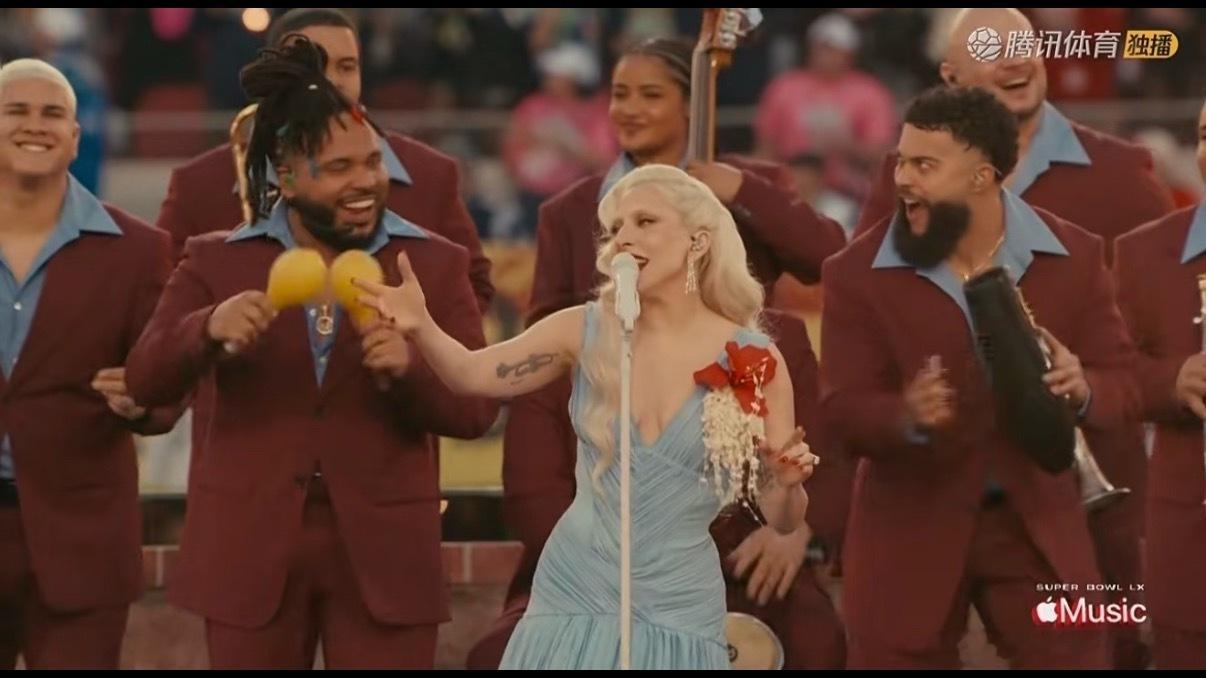 ladygaga空降超级碗中场秀无预警炸场!Gaga与Bad Bunny合唱热单,萨尔萨舞步默契拉满,高定蓝裙配红唇,天后气场瞬间点燃李维斯体育场!