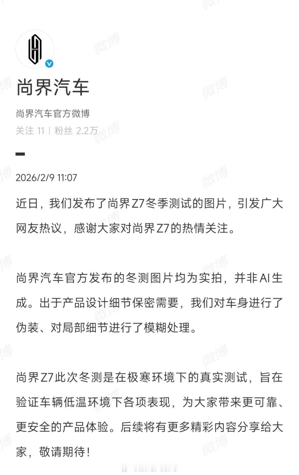 网传尚界Z7冬测图是AI合成?2月9日,尚界汽车正式回应:Z7冬测图片均为实拍,