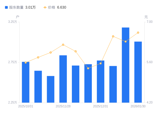 日期A股户数(户)流通A股户均持股数(股)户均持股市值(万元)2026-01-303006017994.0211.932026-01-203180817005.1610.752026-01-092704520000.0113.002025-12-312771819514.4010.852025-12-192726219840.8110.692025-12-102709119966.0511.942025-11-282836519069.2911.842025-11-202580220963.5012.452025-11-102645620445.2811.802025-10-312755619629.1310.97