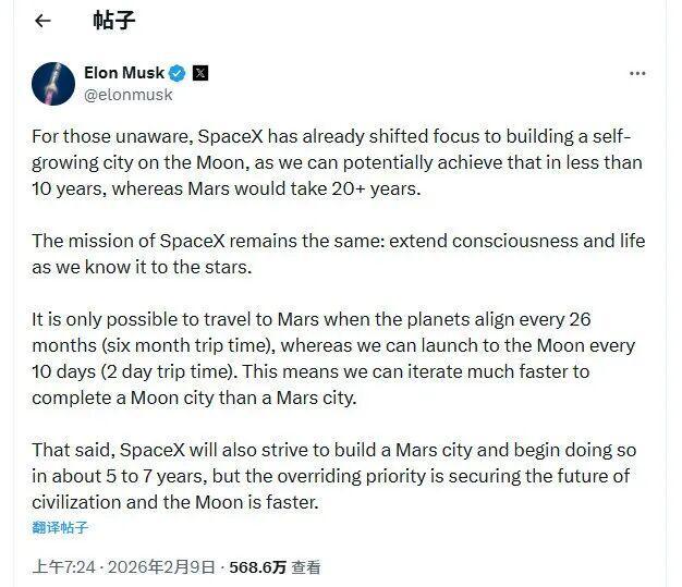 当天,他在社交媒体平台X上发帖写道:“对于那些不了解情况的人来说,SpaceX已经将重心转移到在月球上建造一座扩张型城市上,我们有可能在不到10年的时间内实现这一目标,而火星则需要20多年。”