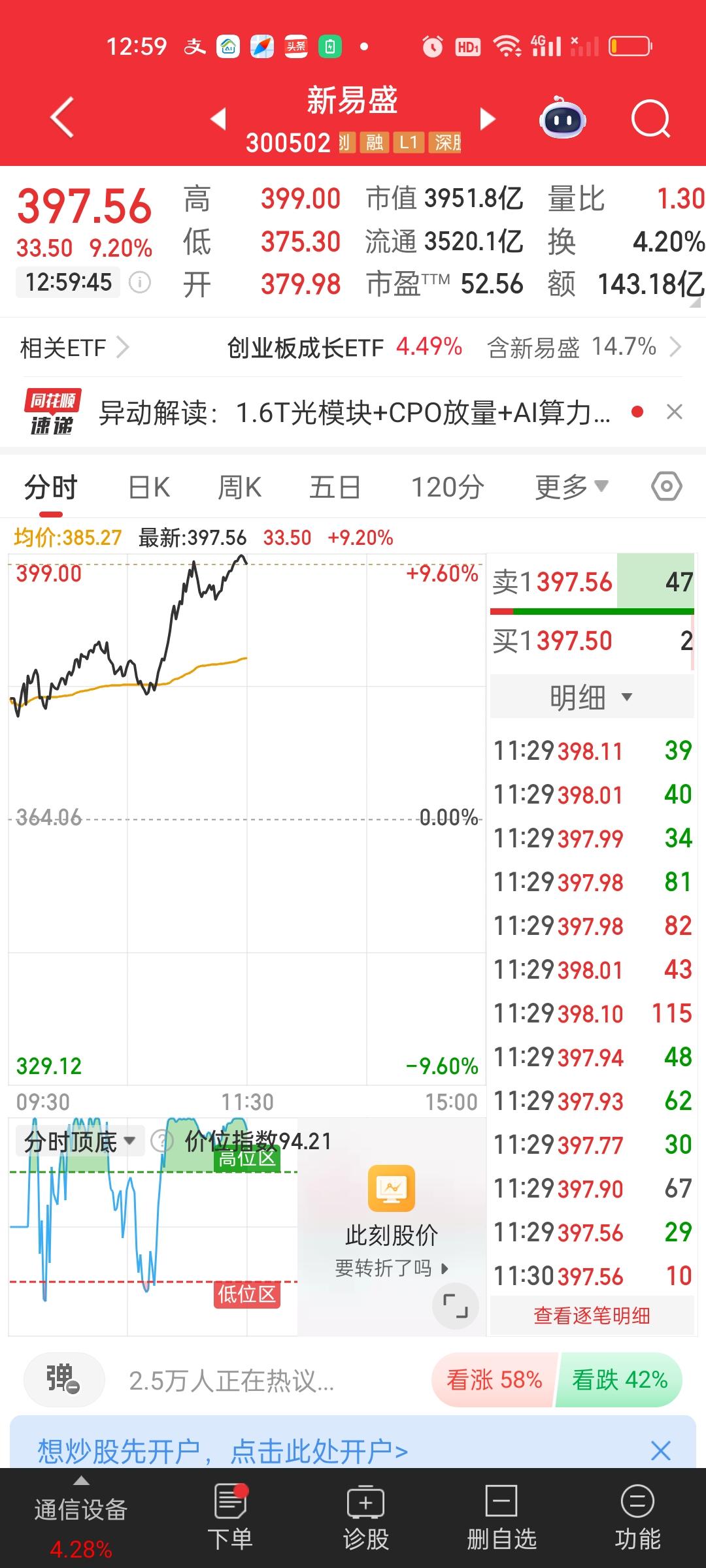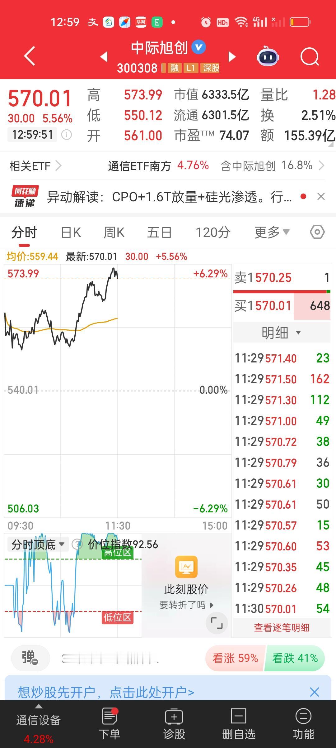 天孚通信20厘米的强势涨停直接引爆了整个CPO板块,目前整个CPO板块涨幅已经接近9%,而且天孚现在买不进去,资金开始扎堆进入中际,易胜,胜宏,沪电等个股。场内ETF方面,人工智能和影视,通信的涨幅是最大的,涨幅都在5.60%以上。