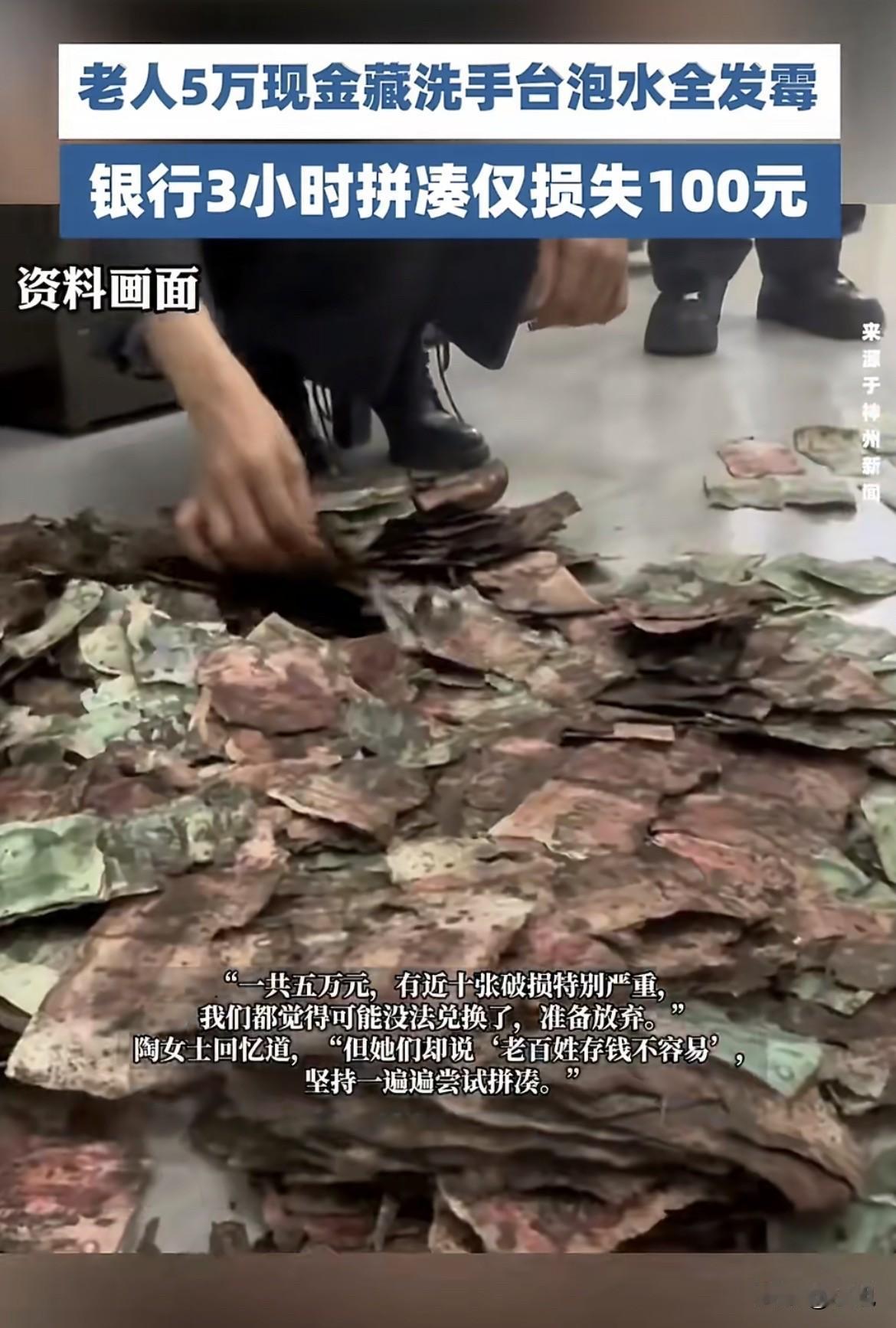 上海陶女士家老人,因为担心突发疾病用钱,又怕电信诈骗,悄悄把五万现金用旧衣服裹好,藏在了洗手台下面的柜子里。 谁也没想到,柜子里的水管悄悄漏了水。 等发现时,一沓沓钞票早就被泡得面目全非,严重发霉、粘连,甚至破损。老人急得团团转,又怕孩子说道,自己先偷偷晾晒,可根本不管用。 一家人捧着这堆“霉钞票”,开始一家银行一家银行地跑。 结果接连碰壁。有的说柜台忙,有的说要请示,就是办不了。希望一点点凉下去,五万块难道真要变成一堆废纸? 抱着最后一点希望,他们走进了上海银行闵行支行。 接下来的三小时,像一场安静的“抢救”。柜员谢漪琳和主管杨萍接手后,直接放弃了午休。面对大量霉烂粘连的纸币,她们一张张分拣,一点点拼接,反复鉴别。手指被霉污染得漆黑,也没停下。 最难的是那十几张破损严重的,几乎拼不回去。连家属都想算了,但工作人员说:“老百姓存点钱不容易。”她们一遍遍尝试,还多次打电话、拍照片跟总行现金中心协调。 最后,按照残损币兑换标准,五万元里成功兑出了四万九千九百元。相当于只损失了一百块。 一场风波,总算有了个暖心的结尾。银行提醒,家里最好别放大量现金,真要放也得注意防潮防火。不过这件事里,比规定更打动人的,是那句“老百姓存钱不容易”,和那三个小时不忍放弃的耐心。 你们家老人也有这种“藏钱”的习惯吗?要是你遇到这种情况,会怎么办?