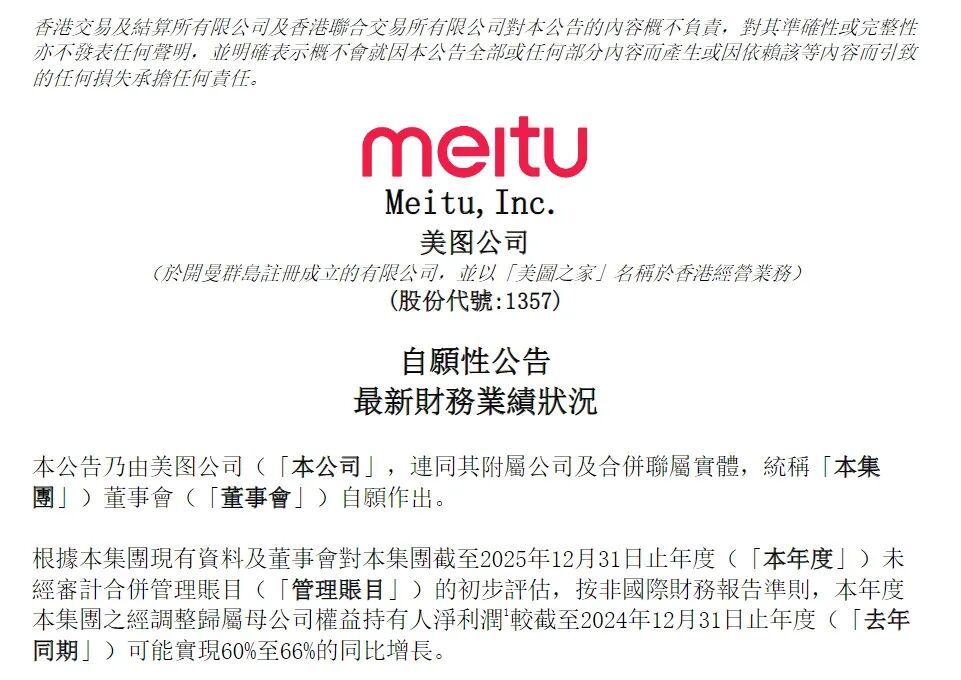 8日,美图公司在港交所披露最新财务业绩状况显示,2025年净利润预计同比增长60%-66%。