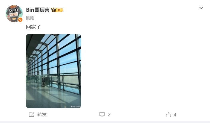 Bin哥更新个人社媒动态:人在机场,准备回家过年!