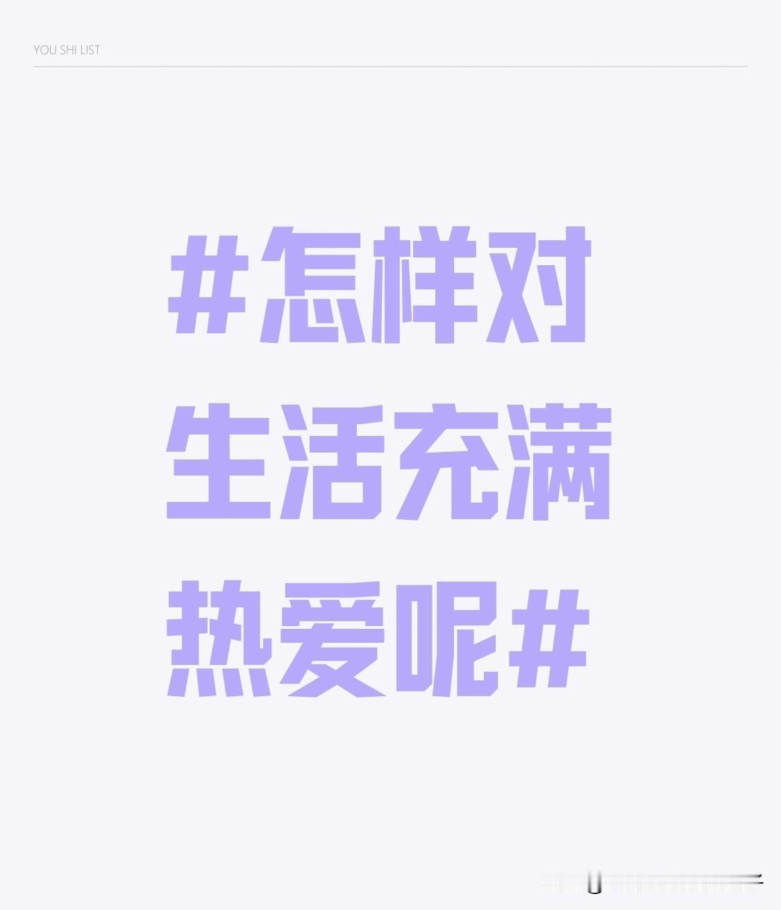 想对生活充满热爱,其实不难。生活的美好藏在日常点滴里。晨起别匆忙,伸个懒腰,拉开窗帘让阳光进来,再喝杯温水唤醒身体。 三餐也别敷衍,早餐热牛奶配水煮蛋,午餐荤素搭配好好品尝,晚餐清淡些。偶尔给自己煮个汤、烤块蛋糕,感受烟火气里的幸福。 平时给自己定小目标,完成后成就感满满。学会感恩,留意身边让自己感动的小事。遇到困难想想自己挺过的那些坎儿。做自己喜欢的事,别太在意外界看法。多和正能量的人相处,心情好了,自然就热爱生活啦。