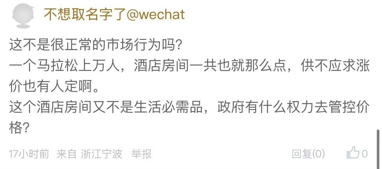 网友吐槽宁海马拉松那几天酒店涨价3倍 ,有人认为这是市场行为,大家怎么看?马拉松赛事临近,酒店涨价3倍,直逼高端酒店!宁波这个地方的操作让网友无语了...3月8日,宁海即将举办2026宁海马拉松赛事。不少马拉松爱好者纷纷报名,有些则已经中选,做起了参赛准备。但是,宁波一位网友“野心放荡者”在备赛时,却因为酒店的问题很是生气。他发帖表示,就因为是周末,就因为有赛事,酒店直接涨价3倍,还没人管从网友的截图中可以看到,3月7日-8日,一间高级大床房的价格是634元,商务大床房则需要671元,几乎已经是高级酒店的价格了。
