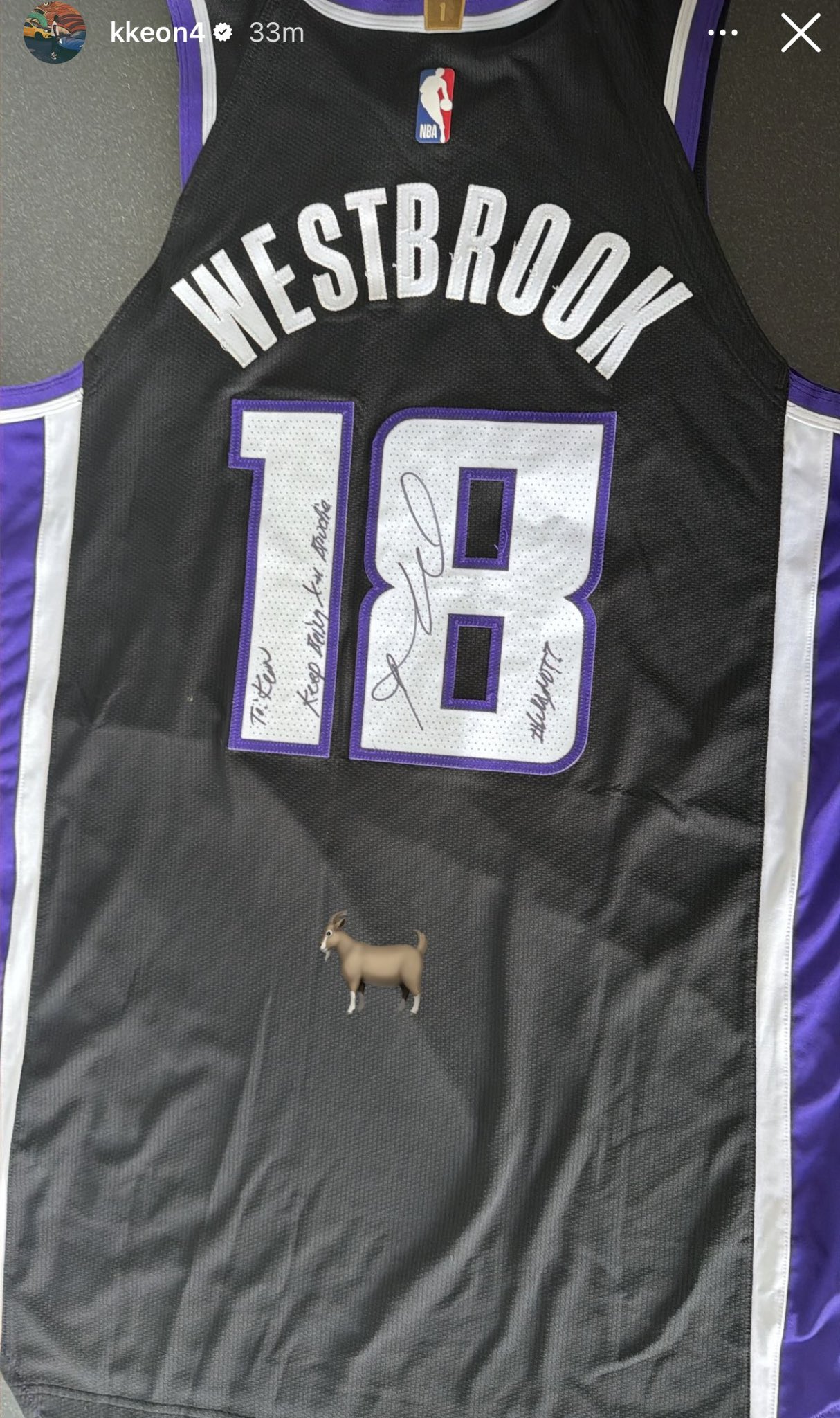 今日,埃利斯更新社媒晒出赛后威斯布鲁克向其赠予的个人签名球衣。