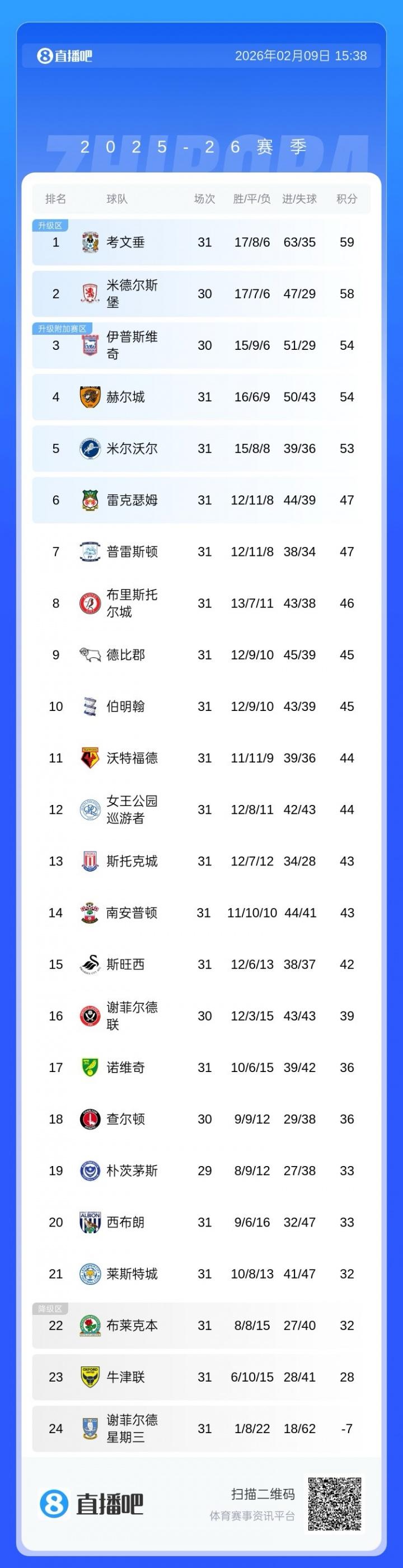 目前米德尔斯堡30轮积58分排在英冠第二,谢菲尔德联积39分排在第16。