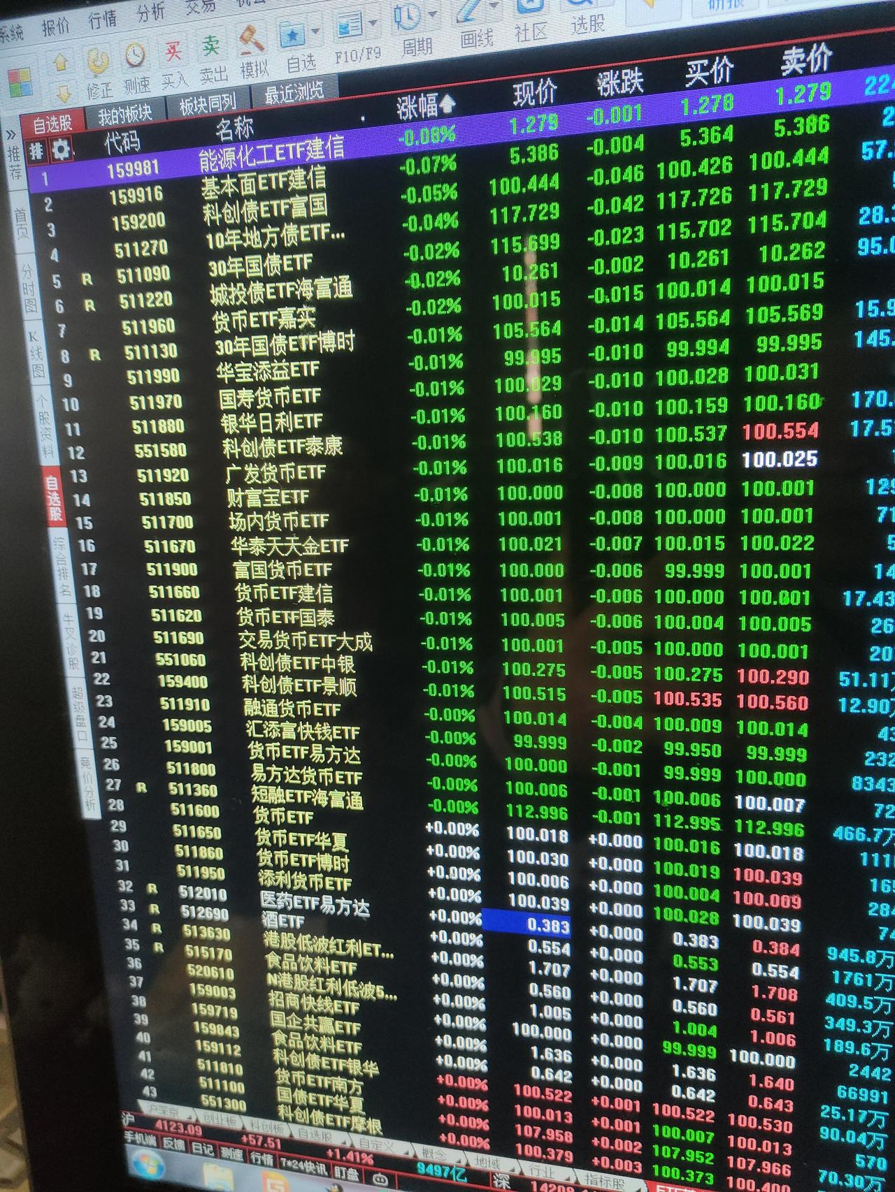 现在场外基金的估值又看不到,搞的加仓补仓都不好操作。慢慢地越来越多的基民会开始把资金从场外转移到场内。场内毕竟来说透明度,上手的速度都要更好。场内ETF今天涨幅居前的是影视,创业板人工智能,通信设备,科创板,传媒,涨幅都在4.50%以上,跌幅方面可以忽略不计,跌最多的一只也就跌了0.08%。