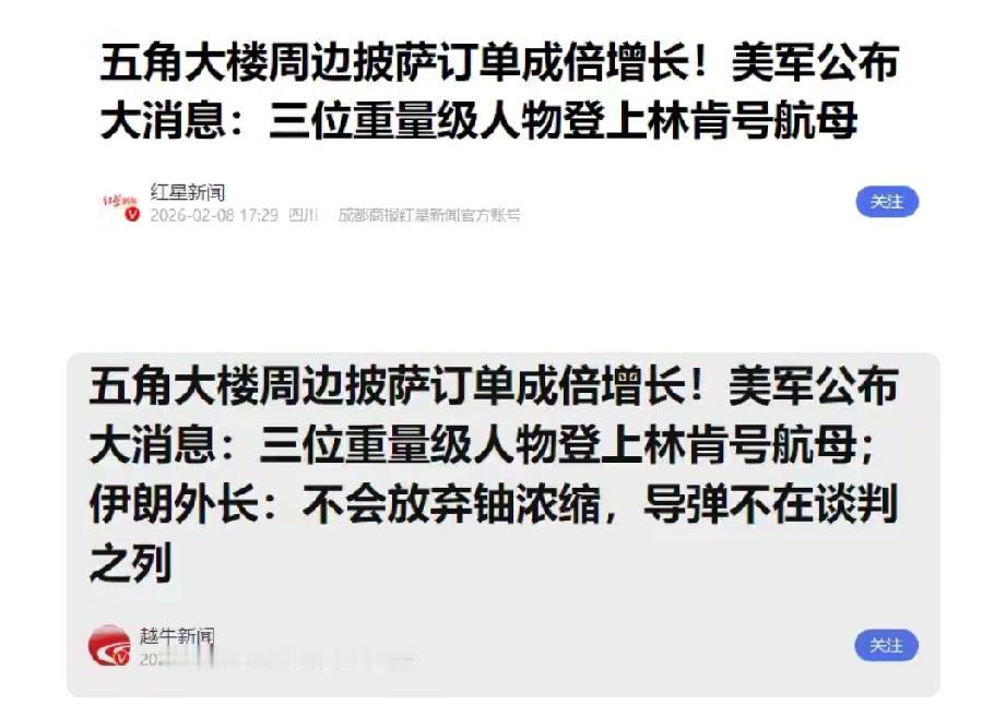 美国这是闹哪样?当地时间2月8日消息,五角大楼周边披萨订单成倍增长。像距离五角大楼1.0英里的District Pizza Palace活动量飙升至250%,同距离的We, The Pizza达到149%,0.5英里处的Extreme Pizza也有143%,“披萨指数”警戒等级为3级。“披萨晴雨表”意味着美国政府部门可能在加班。 与此同时,美军公布三位重量级人物登上林肯号航母。美伊核谈正受关注,双方刚在马斯喀特间接谈判,特朗普称下周再谈,伊朗表明核立场,这一系列动作背后,不知又要搞出什么“幺蛾子”。