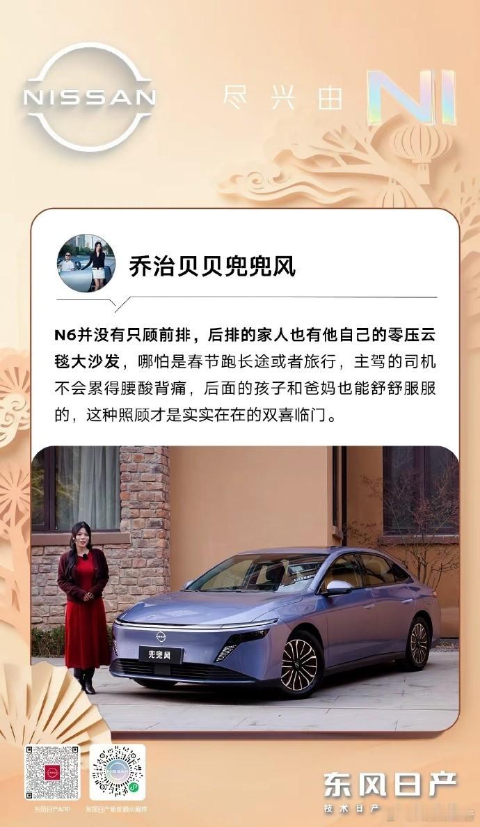春节返乡神车N6东风日产n6座椅舒适、行驶平稳,被称春节返乡神车;天籁则主打全天候舒适,座椅按摩与鸿蒙座舱带来放松体验,两款车都以舒适贴心满足用户出行需求。9万级高颜值超舒适插混N6新年开大紫大红大N6东风日产不负星光赶路人