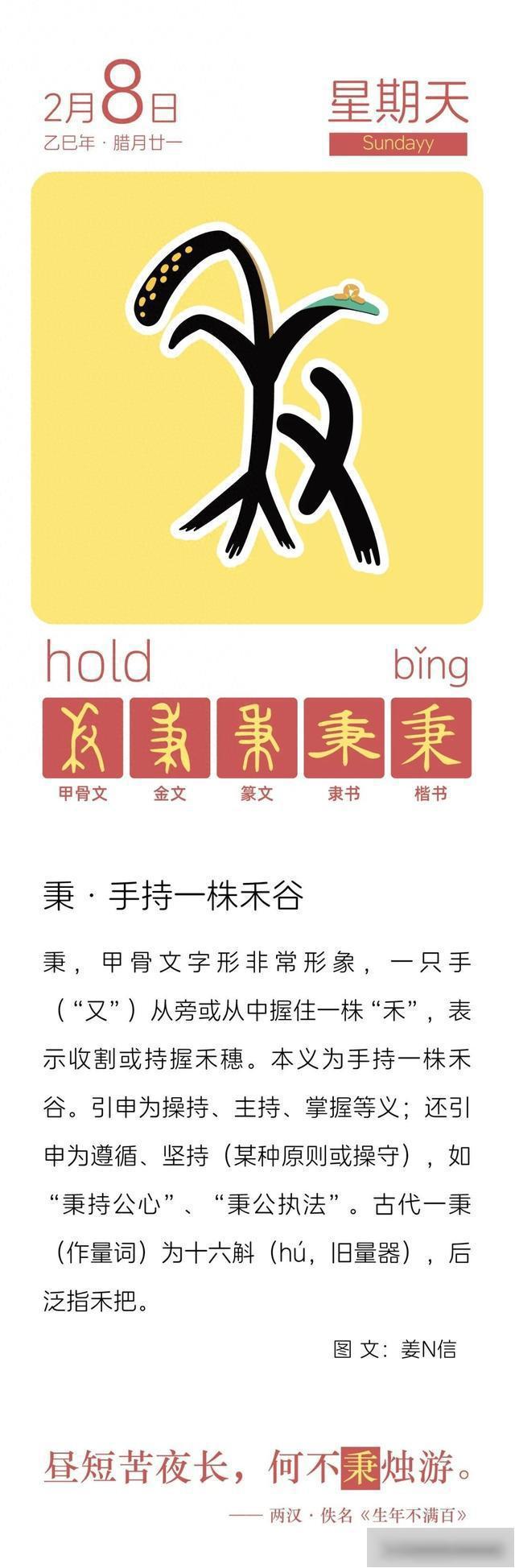 秉,甲骨文字形非常形象,一只手(“又”)从旁或从中握住一株“禾”,表示收割或持握禾穗。本义为手持一株禾谷。引申为操持、主持、掌握等义;还引申为遵循、坚持(某种原则或操守),如“秉持公心”“秉公执法”。古代一秉(作量词)为十六斛(hú,旧量器),后泛指禾把。