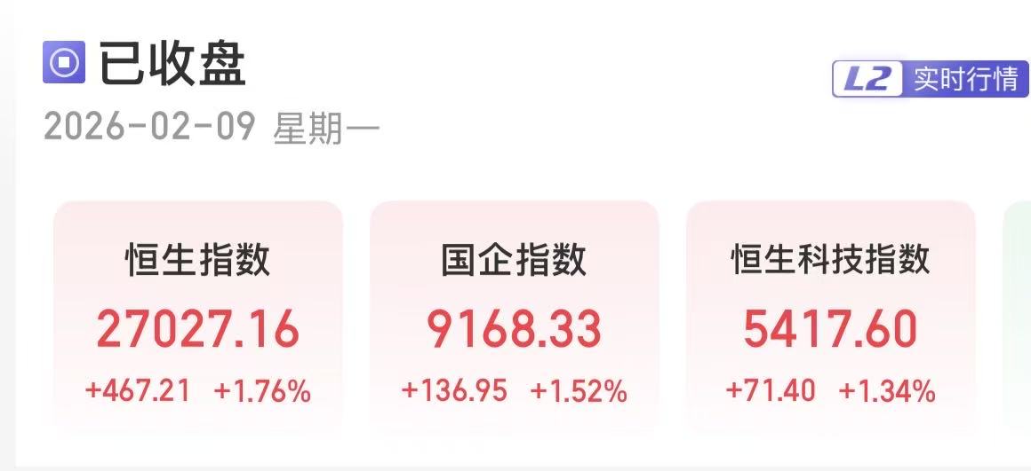 上证报中国证券网讯(刘禹希记者严晓菲)2月9日,港股三大指数收涨。截至收盘,恒生指数涨1.76%,报27027.16点;恒生国企指数涨1.52%,报9168.33点;恒生科技指数涨1.34%,报5417.6点。
