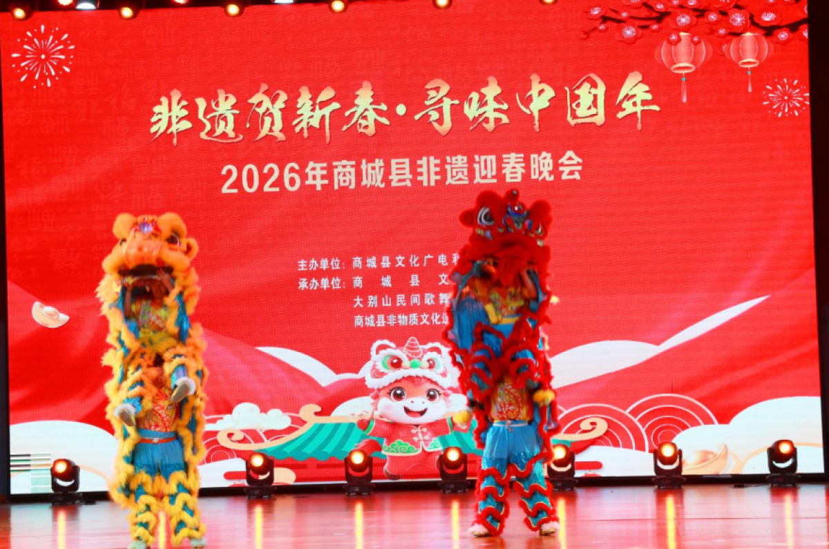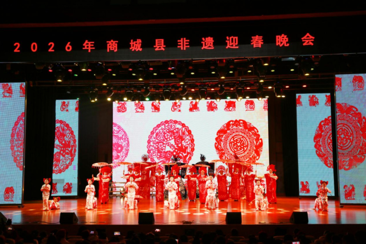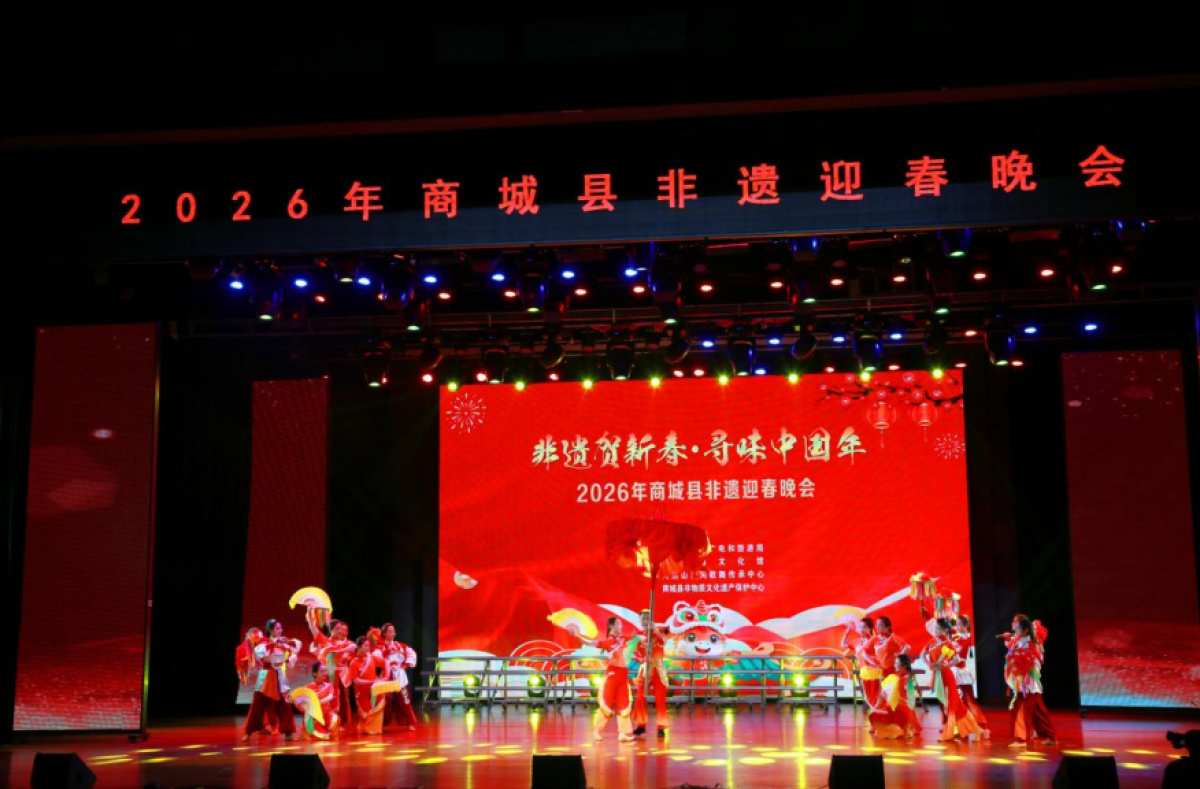 为丰富群众精神文化生活,营造欢乐祥和的新春氛围,展现非遗时代价值,弘扬中华优秀传统文化,近日,由商城县文化广电和旅游局主办,商城县文化馆、大别山民间歌舞传承中心、商城县非物质文化遗产保护中心共同承办的“非遗贺新春·寻味中国年”——2026年商城县非遗迎春晚会,在商城影剧院隆重上演,为该县人民献上了一场融传统韵味与时代气息于一体的文化盛宴。