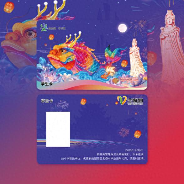 在十五运会开幕式上,一条“鳌鱼”缓缓“游入”,伴随灯光水晕流转生辉。本次学生卡的设计正源于2026年粤港澳大湾区灯会“鳌鱼凌云”灯组形象。鳌鱼腾云驾雾、姿态矫健,仿佛即将从卡片中跃入现实。环绕四周的是充满未来感的光影线条。这既是一份送给学子们“凌云直上,独占鳌头”的美好祝愿,也是一张值得收藏的湾区文化名片。