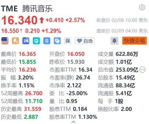 格隆汇2月9日|上周五(6日)收涨2.57%的腾讯音乐(TME.US)今日美股盘前续涨1.29%,报16.55美元。消息面上,花旗发报告指,预期腾讯音乐2025年第四季业绩将符合预期或略胜预期,主要由于稳定的订阅服务及非订阅音乐收入的加速增长。展望2026年,该行认为关键关注点包括竞争格局与抖音SodaMusic潜在威胁、SVIP转换率及每用户平均收入趋势、线上广告收入、音乐演唱会收入更新、喜马拉雅的最新状况、毛利率与经营利润率趋势。该行维持对腾讯音乐美股“买入”评级,目标价29美元。(格隆汇)