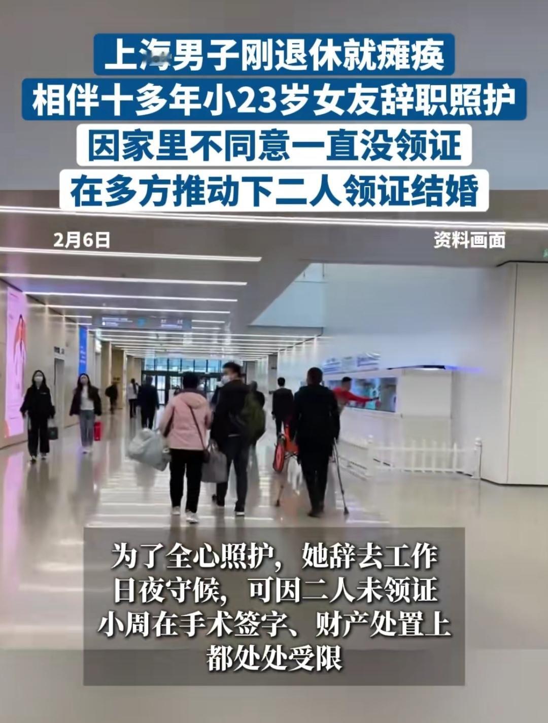 都说感情里最经不起考验的是现实,可有些感情,偏是在现实的泥沼里,才显出到底有多真。上海这对相差23岁的情侣,就用一场突如其来的意外,把这份感情摆在了所有人面前。 大叔刚退休就突发意外瘫痪在床,小23岁的女友二话不说辞了工作,贴身照顾他的饮食起居。可这份掏心掏肺的付出,却因家人反对婚事、两人未领证,让她连个法定身份都没有,出钱出力还落得无名无分,终究是熬到了崩溃。 没人撑腰、独自垫付医药费,连照顾的签字权都没有,女友的难,看的人心里发酸。好在居委会、残联多方介入协调,家人态度终于松动,两人顺利领证,女友也终于有了名正言顺的身份,大叔也被纳入重点关怀,所有难题总算有了眉目。