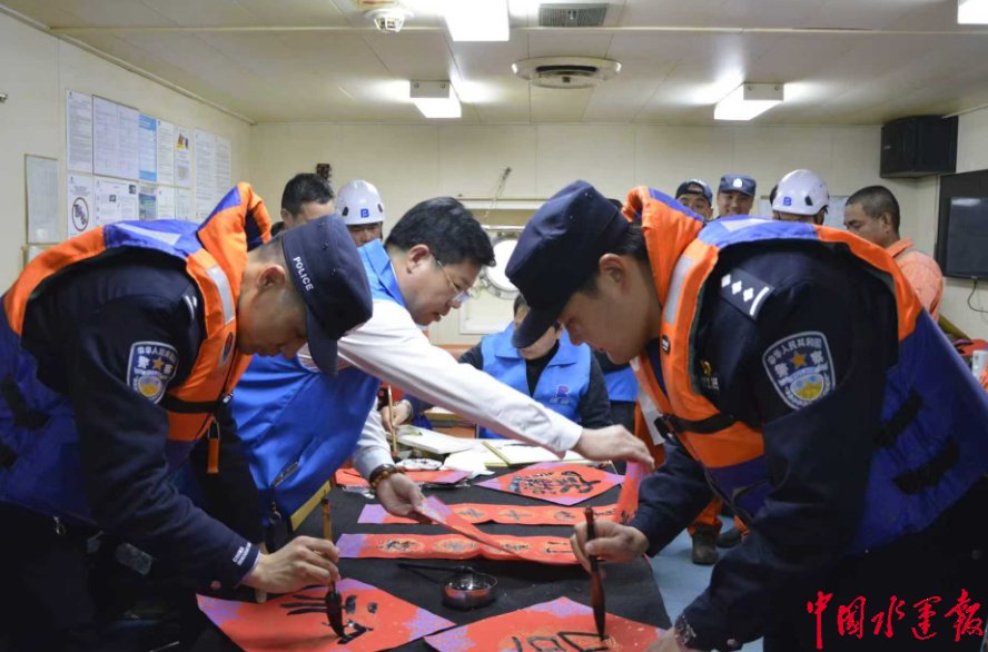 民警与书法家共同为船员写福。