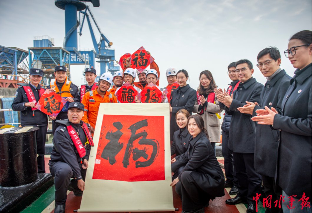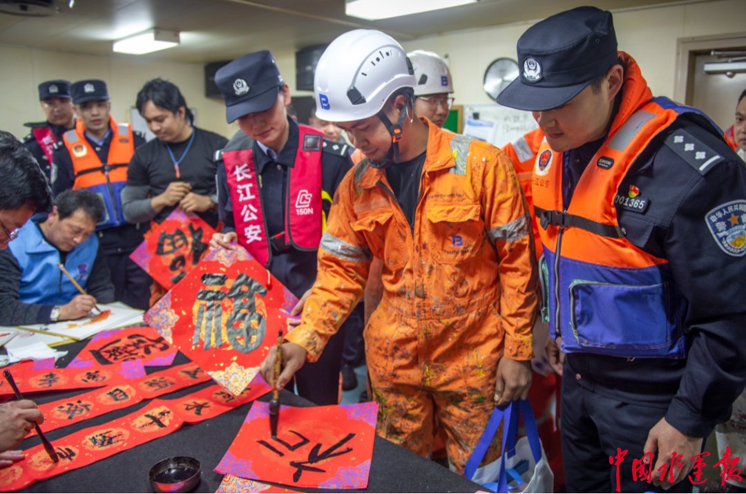 2月5日下午,停靠在镇江新民洲码头的香港籍货轮“坦帕湾”上,墨香与笑语交织,年味随江风流动。长江航运公安局镇江分局扬州派出所联合润州区司法局、文联、边检站等单位,共同举办“江上枫桥新春同舟”迎新春活动,让中外船员在船头共迎中国年。