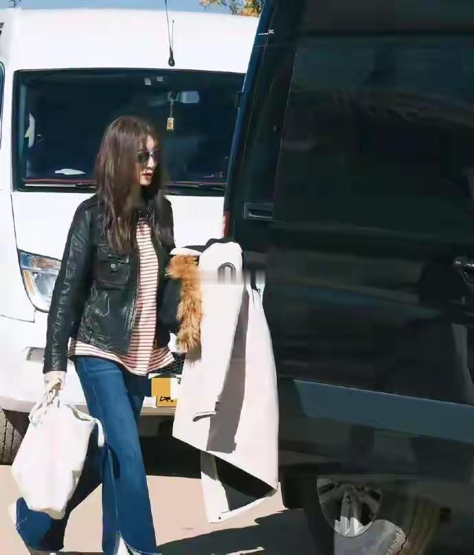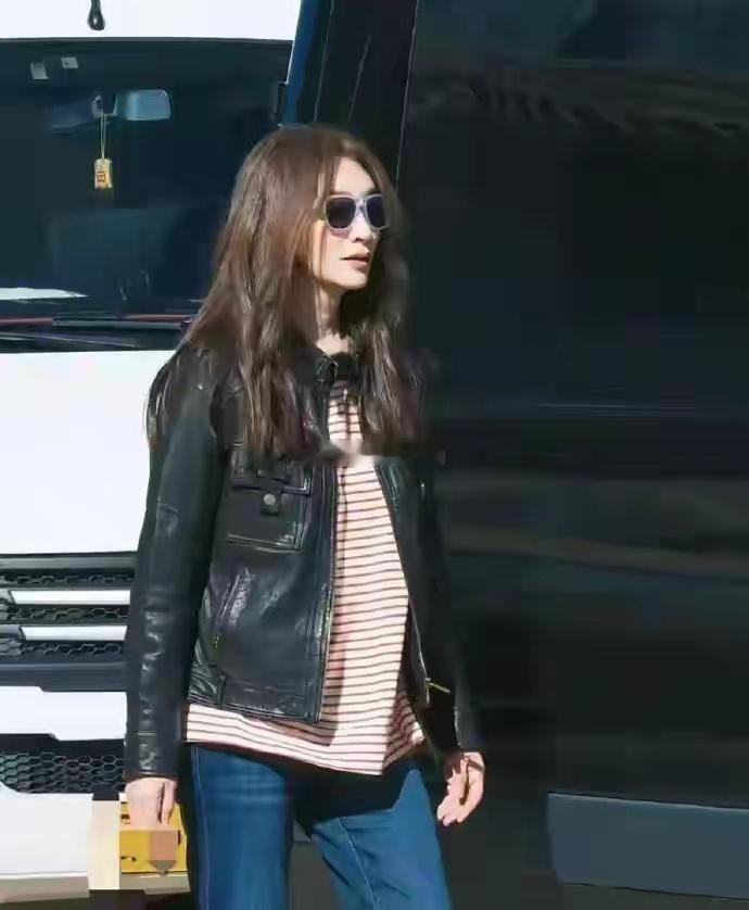 李小冉的中年穿搭真时髦!黑色皮衣+条纹长袖+牛仔裤,休闲又减龄 !!!!!