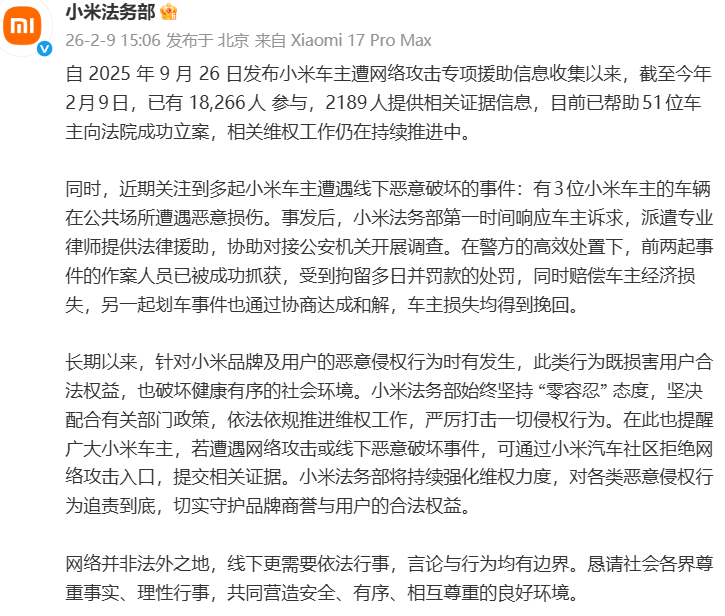 电动知家消息,2月9日,小米法务部官方发布消息称,目前已帮助51位车主向法院成功立案。2025年9月26日,小米启动启动“小米车主遭网络攻击专项援助”,截至今年2月9日,已有18,266人参与,2189人提供相关证据信息。