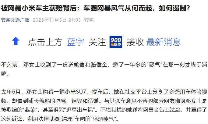 早在2025年9月,小米创始人、董事长兼CEO雷军在接受媒体采访时就曾提及,小米汽车发布后成为全网被黑最惨的车企之一。小米汽车车主在视频平台分享提车、用车体验时,经常遭遇了恶意网暴,甚至收到不堪入目的私信咒骂。去年11月据安徽交通广播报道,邓女士购得一辆小米SU7。提车后,她在社交平台上分享了多条用车体验视频,却遭到铺天盖地的辱骂、诅咒和造谣。与其选车意见不合的部分网友嘲讽邓女士是被欺骗的“韭菜”,甚至诅咒“迟早出车祸”。不堪其扰的她遂将网暴者告上法庭,并赢得了这起诉讼。