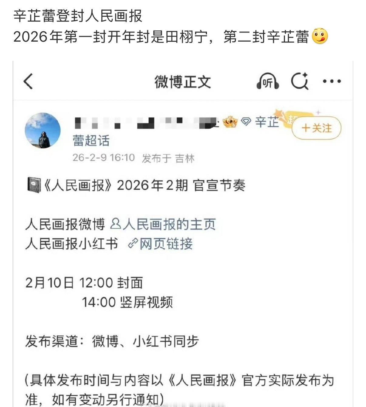 辛芷蕾上的是人民画报正刊以前上过这个杂志的单人封的只有巩俐、张艺谋、宁静等,上一个单人封是2012年的姚晨。