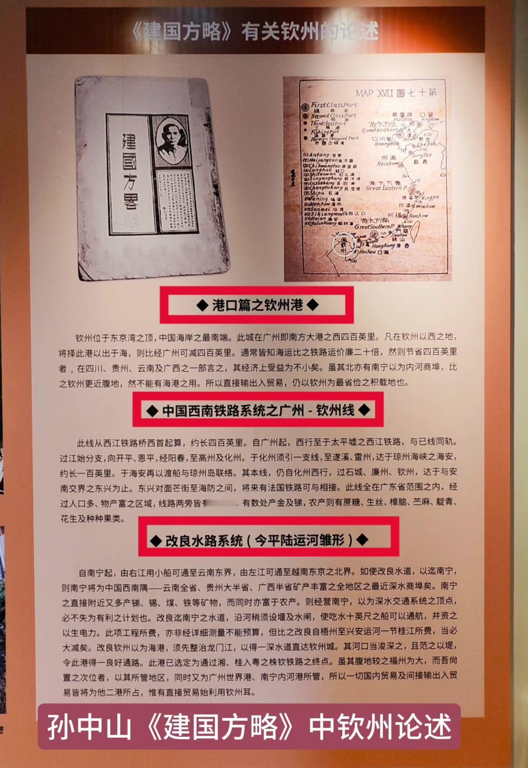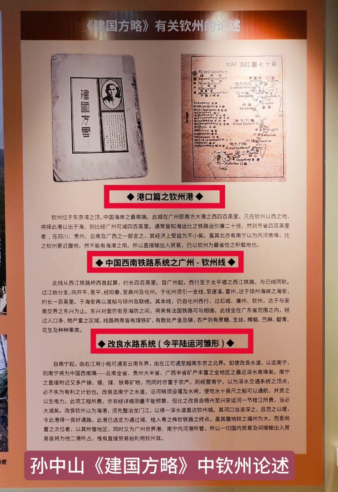 1️⃣钦州港优势:位于广州南方大港西四百英里,是西南腹地(四川、贵州、云南等)最省俭的积载地,比经广州缩短四百英里,海运成本更低。虽南宁为近腹地内河商埠,却无海港之利。 2️⃣广州-钦州铁路线:长约四百英里,从广州西行至太平墟西江铁路分支,经开平、恩平、阳春、高州、化州,化州分支至遂溪、雷州、海安(与琼州岛轮渡连接),本线继续西行至钦州、东兴(与越南铁路相接),沿线物产丰富,煤铁金银等资源充足。 3️⃣平陆运河雏形:改良右江、左江水道至南宁,使其成为西南矿产(锑、锡、煤、铁)及农产(蔗糖、生丝等)的最近深水商埠,需设堰闸使十英尺吃水船通航并发电,成本低于桂江运河;同时整治钦州龙门江,浚深河口筑堤,作为株钦铁路终点,但腹地部分被广州、南宁港覆盖,仅直接贸易适用。