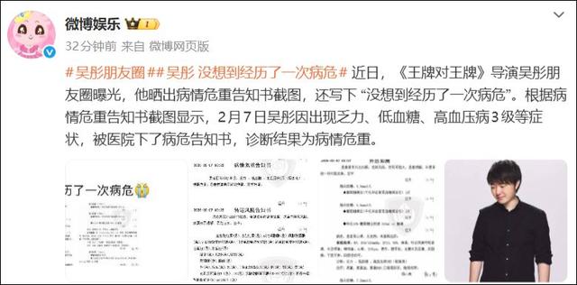 据微博娱乐,近日,《王牌对王牌》导演吴彤朋友圈曝光,他晒出病情危重告知书截图,还写下“没想到经历了一次病危”。根据病情危重告知书截图显示,2月7日吴彤因出现乏力、低血糖、高血压病3级等症状,被医院下了病危告知书,诊断结果为病情危重。