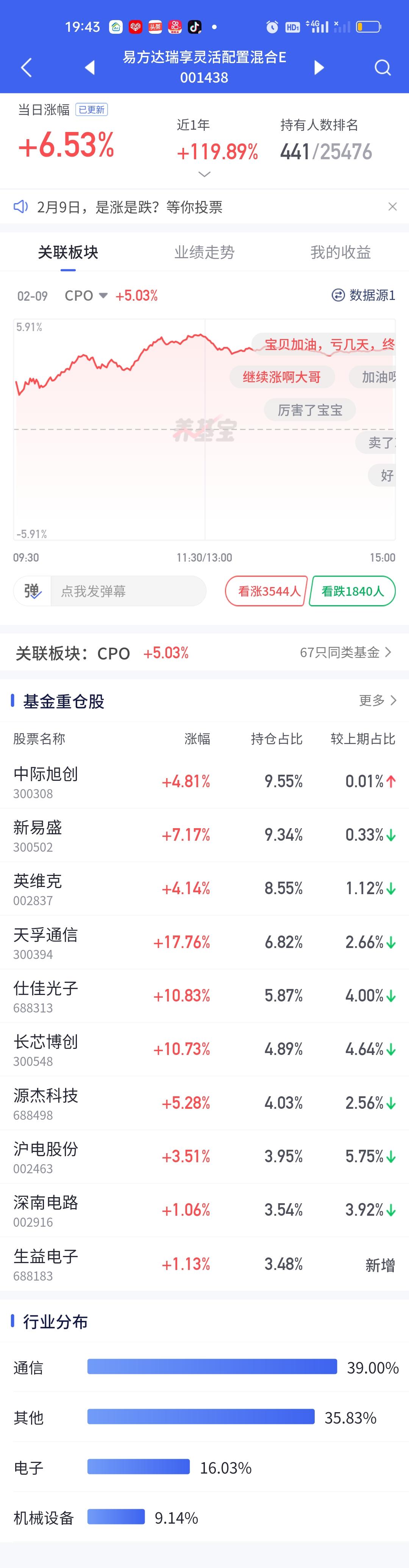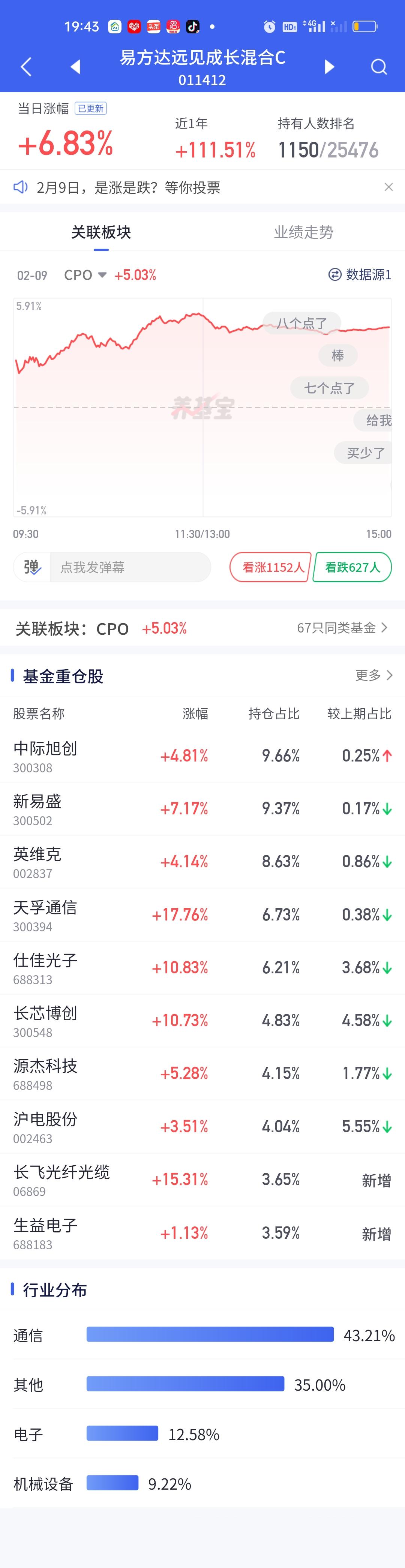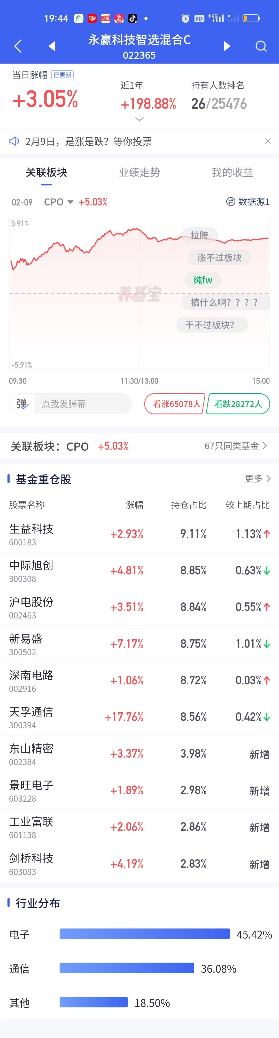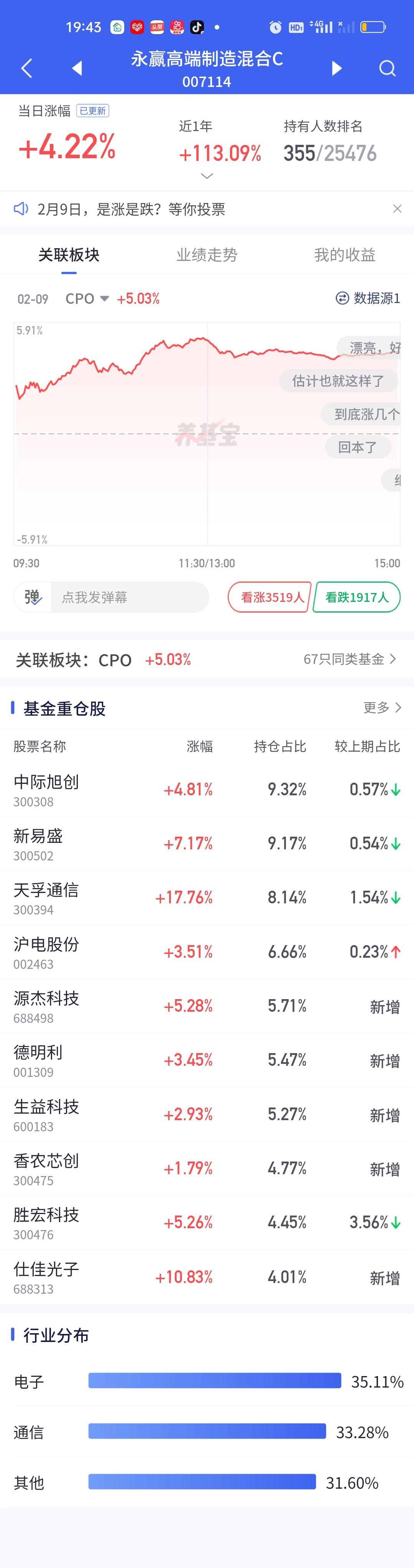 今天永赢科技智选的表现又一次让人失望了。整个CPO板块暴涨,多只基金涨幅在7%以上,而永赢科技智选只开了3.05%,勉强保住了3%的涨幅。说句实在话,这个涨幅让人是非常失望的。同门师兄弟永赢高端制造表现虽然比它强一些,但也只涨了4.22%。