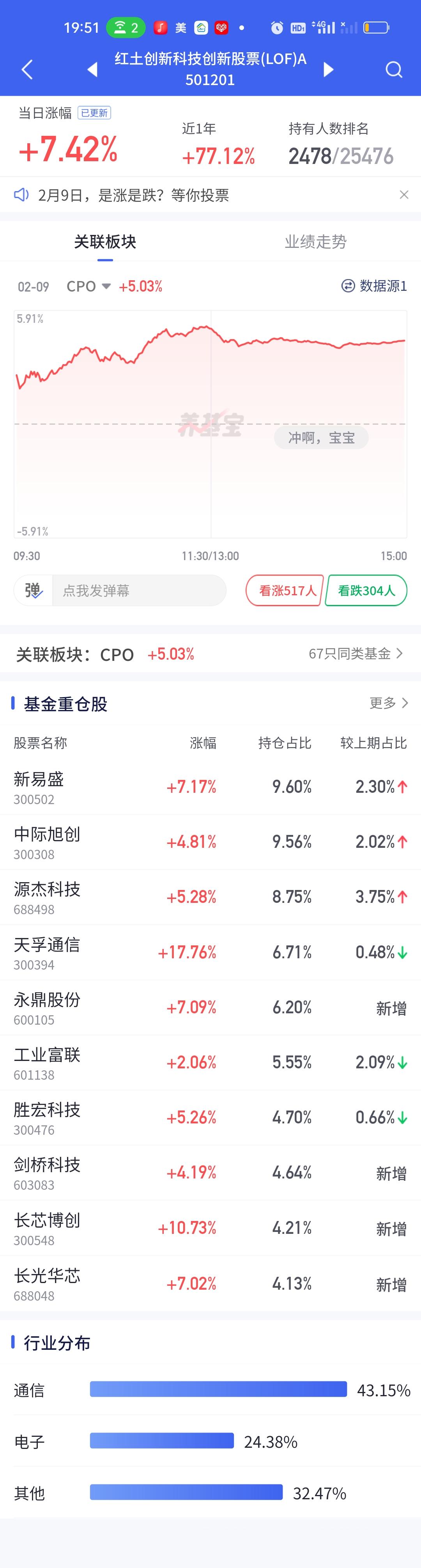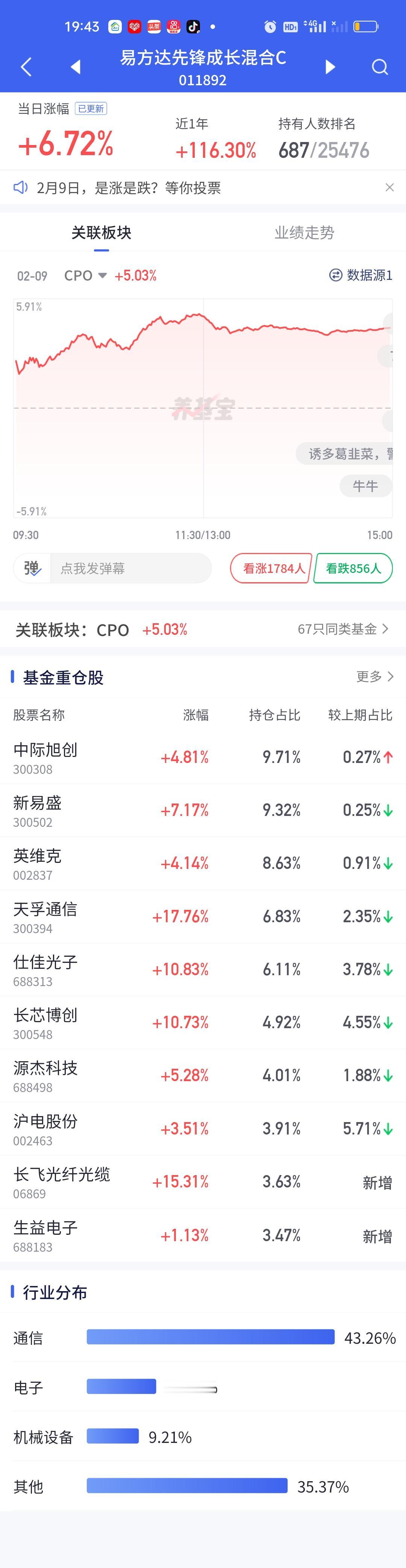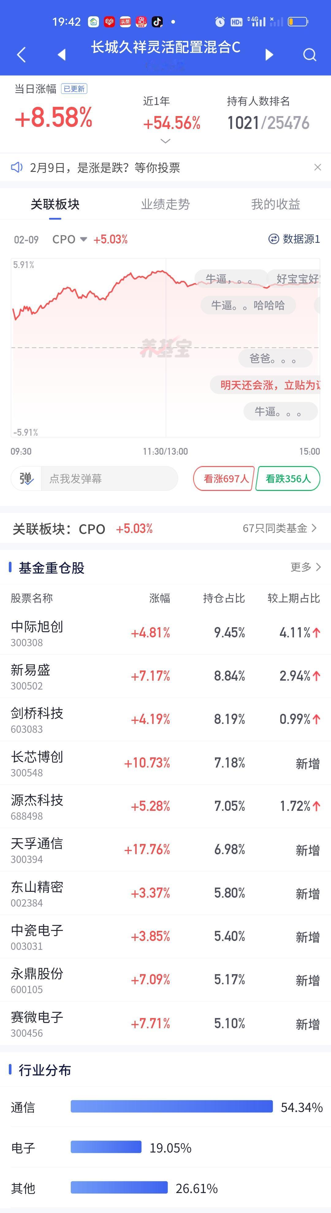 今天永赢科技智选的表现又一次让人失望了。整个CPO板块暴涨,多只基金涨幅在7%以上,而永赢科技智选只开了3.05%,勉强保住了3%的涨幅。说句实在话,这个涨幅让人是非常失望的。同门师兄弟永赢高端制造表现虽然比它强一些,但也只涨了4.22%。