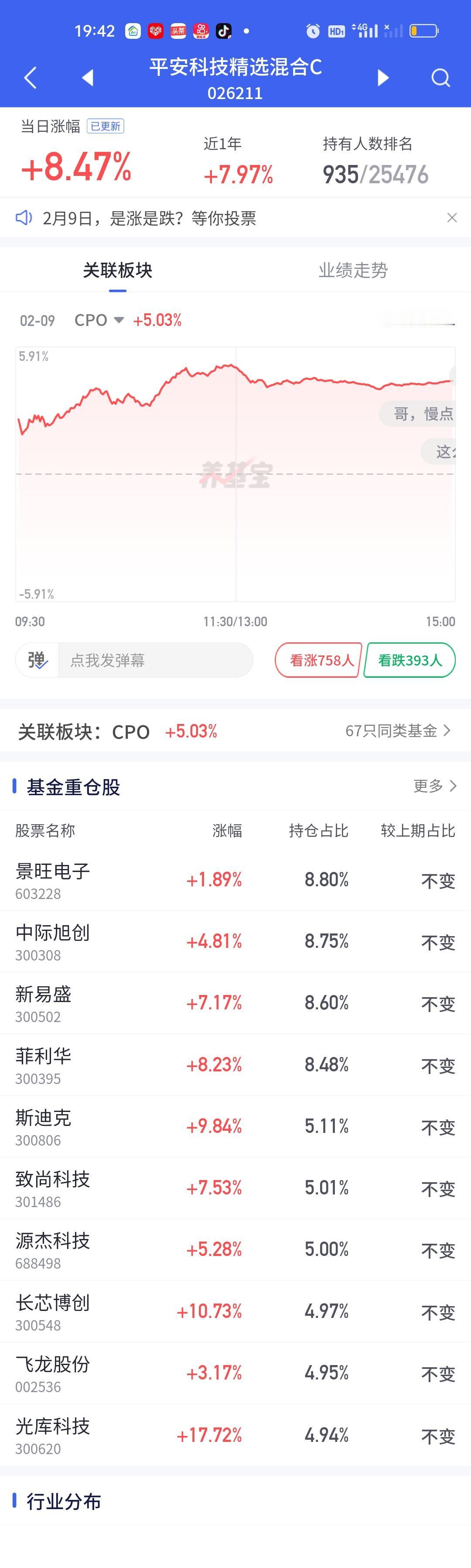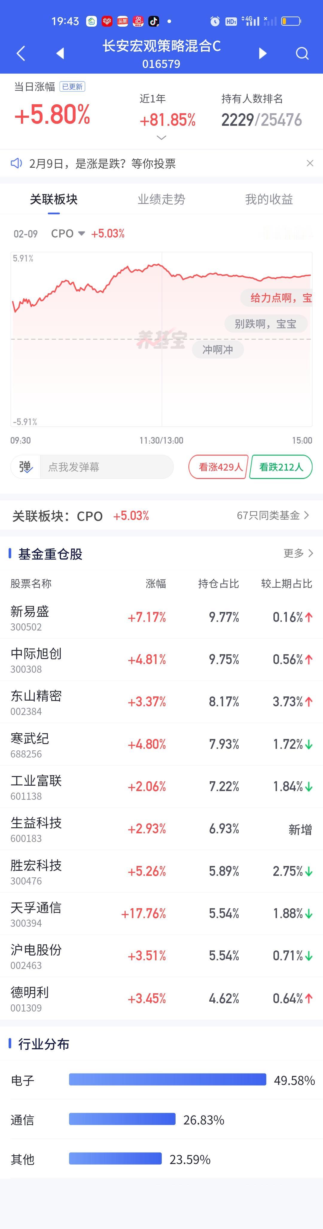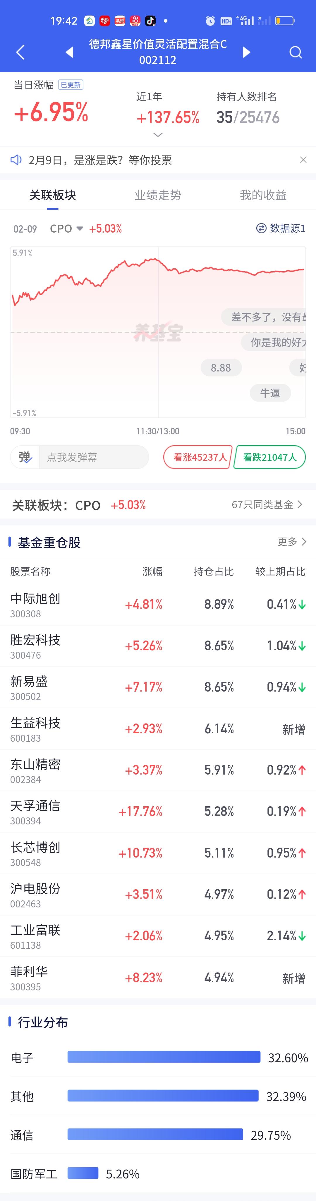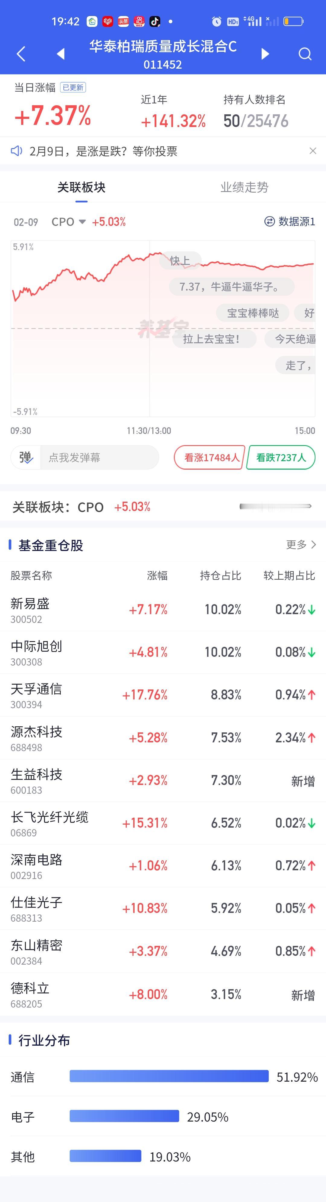 今天永赢科技智选的表现又一次让人失望了。整个CPO板块暴涨,多只基金涨幅在7%以上,而永赢科技智选只开了3.05%,勉强保住了3%的涨幅。说句实在话,这个涨幅让人是非常失望的。同门师兄弟永赢高端制造表现虽然比它强一些,但也只涨了4.22%。