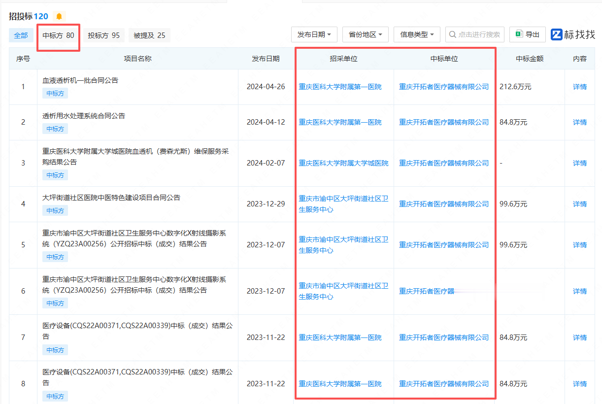 据企查查,其持股99%的重庆开拓者医疗器械有限公司实缴资本有1000万元,该公司在2016年到2024年间多次中标重庆本地医疗机构的招采项目。企查查披露的其作为中标方的记录达到80条。如2024年中标重庆医科大学附属第一医院的血液透析机采购,中标金额212.6万元;2023年中标重庆市綦江区人民医院282.4万元的超声支气管镜等医疗设备采购;2018年中标重庆医科大学附属大学城医院242万元的平板数字化多功能医用诊断X线透视摄影系统采购等。
