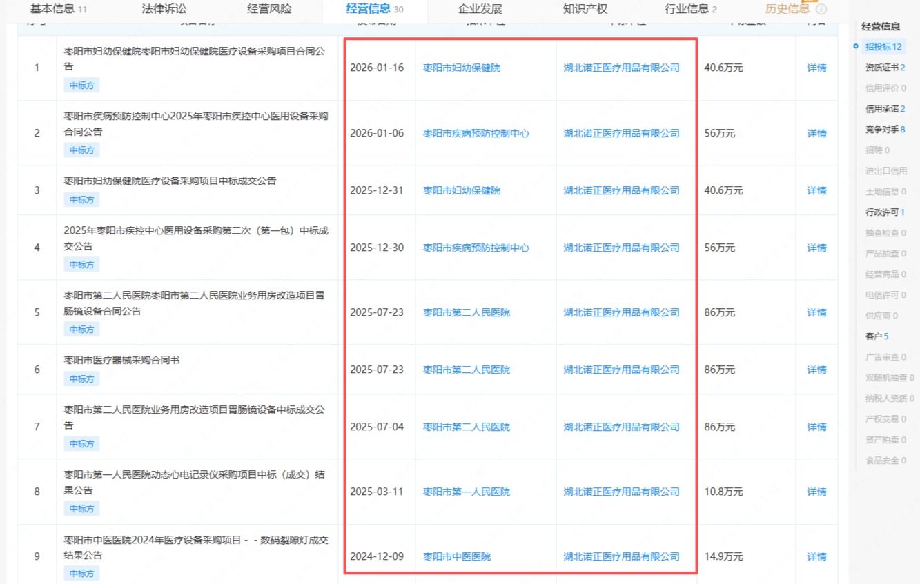 其中,湖北诺正近两年多次中标湖北省襄阳市下辖的枣阳市当地医疗机构采购项目。如2026年1月湖北诺正中标枣阳市妇幼保健院40.6万元的医疗设备采购项目,同月中标枣阳市疾病预防控制中心56万元的医用设备采购;2025年6次中标枣阳市第二人民医院等单位的医疗器械采购项目等。