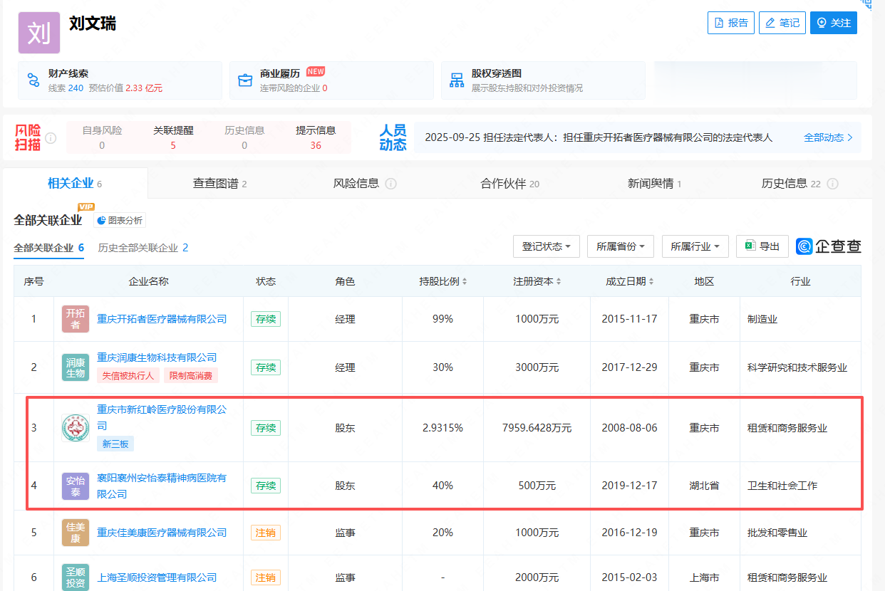 除此之外,刘文瑞在重庆的医疗行业具备涉足颇广。