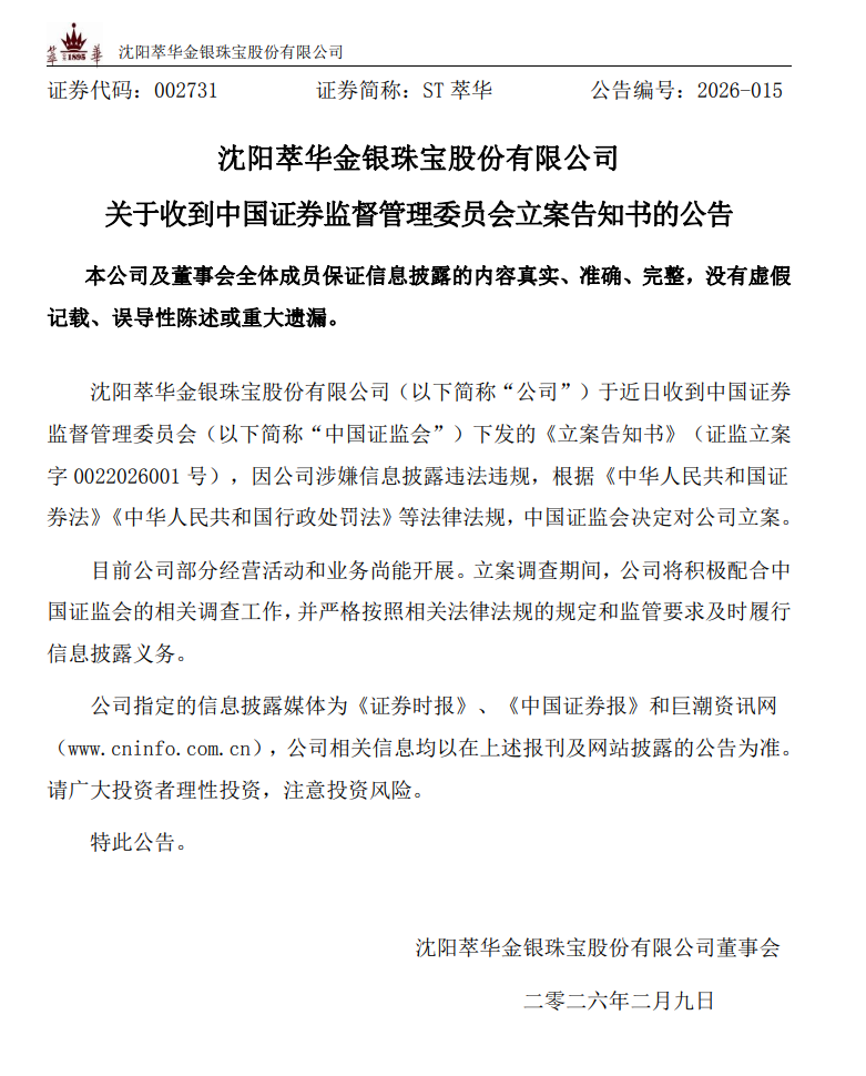 2月9日,萃华珠宝(002731.SZ)发布公告。公司于近日收到中国证监会下发的《立案告知书》,因公司涉嫌信息披露违法违规,中国证监会决定对公司立案。目前公司部分经营活动和业务尚能开展。在立案调查期间,公司将积极配合中国证监会的相关调查工作,并严格按照相关法律法规的规定和监管要求及时履行信息披露义务。