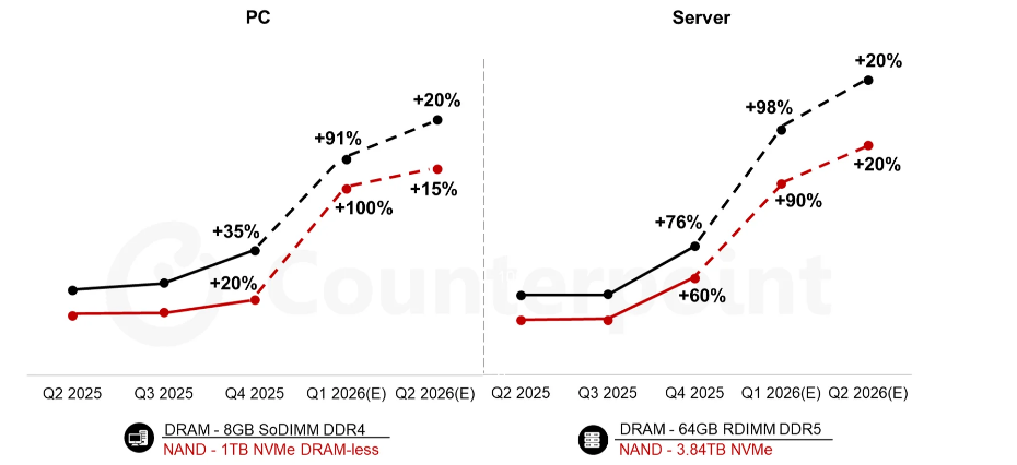 PC和服务器内存价格趋势(2025年第二季度至2026年第二季度预测)