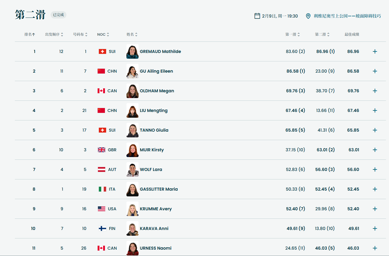 第二次出发过后,加拿大选手格雷莫德86.96分升至第一,谷爱凌86.58分继续暂列第二,刘梦婷67.46分排名第四。