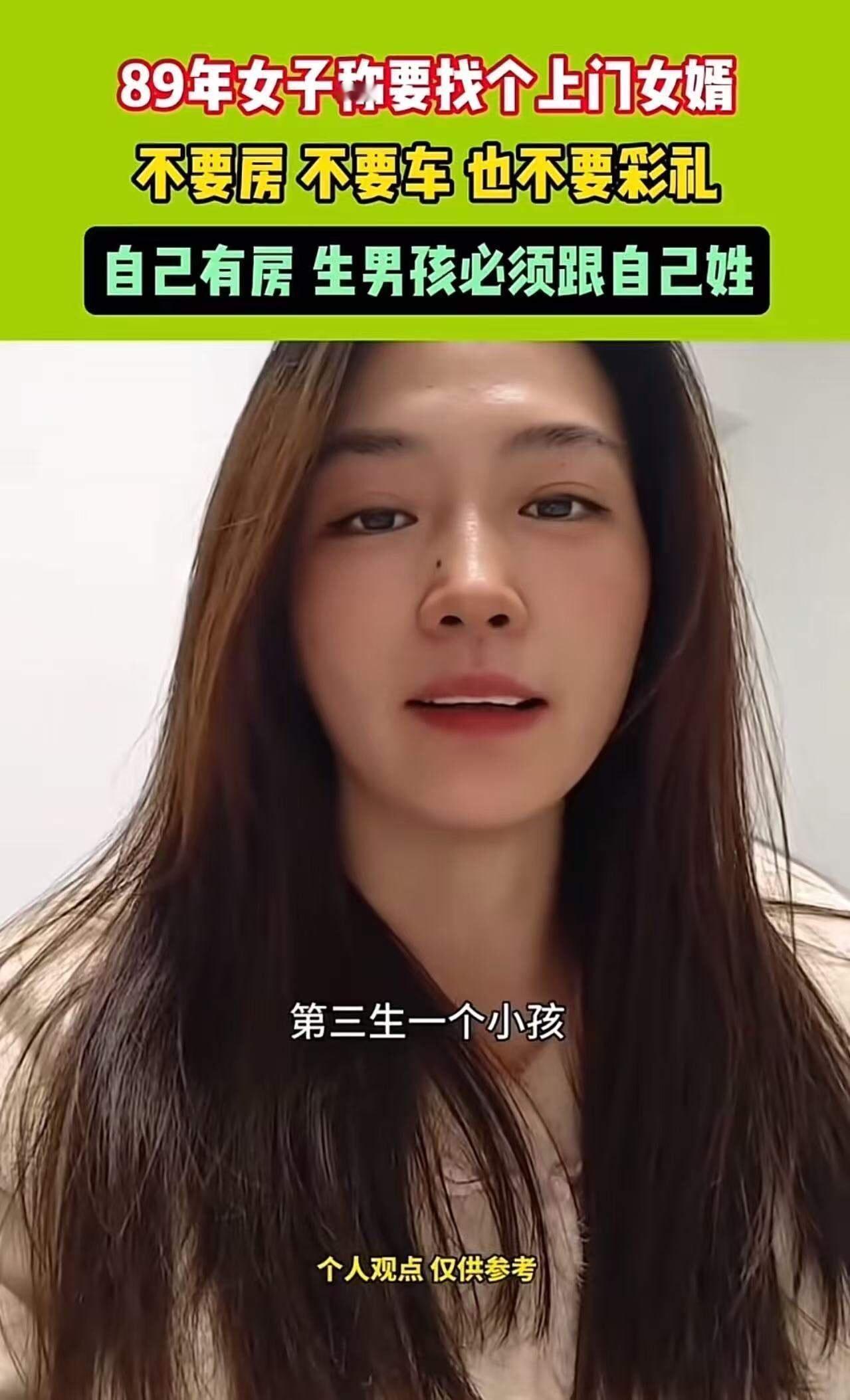 89年女子称要找个上门女婿,不要车不要房 也不要彩礼,但是生男孩必须跟自己姓!网友:89年女子的这个“特殊”要求,瞬间点燃了网友们的热烈讨论。有人说,这是一份“真爱”的宣言,也有人觉得她是在“设局”。但无论怎么看,这都反映出现代社会中一些深层次的婚恋观念变迁和价值观碰撞。 她的条件很简单:不要车、不要房、不要彩礼,但有一条硬性规定——生男孩必须跟自己姓!这究竟是在坚持什么?是对传统的尊重?还是对未来家庭的“硬核”主导权?有人说,这反映出很多女性对于自己家庭和未来的掌控欲望,尤其是在“男尊女卑”的传统观念逐渐被打破的今天,她用这样的要求表达了对自主权的渴望。 网友们的评论也五花八门。有的站在女性角度,表示理解:在传统偏见依然严重的社会背景下,很多女性希望在婚姻中保留自己的名字,体现平等和尊重。“我支持她,婚姻不是买卖,平等才是关键。”有人这样说。 但也有人质疑:这是不是太现实了?“生男孩还要跟自己姓,这是不是给未来的孩子埋下了‘性别歧视’的隐患?”“难道在她心中,男孩才是家庭的未来?这真是对性别平等的背离。”甚至有人调侃:“她这是要在婚姻里设‘霸王条款’,要么完全平等,要么不结。” 更有一些网友则从人性和社会制度的角度看问题——她的要求反映出的是一种“自主选择”的力量,一种对传统束缚的反抗。“现代女性越来越希望在婚姻中拥有话语权,这不也代表了社会在逐步进步吗?”但也有人担心,这样的“硬性条件”是不是会让婚姻变得更难实现,变成了一场“交易”。 这个故事折射出当代年轻人对于婚姻、家庭甚至性别观念的多元思考——自由、平等、尊重,似乎都在逐渐成为主流价值,但传统的阴影依然挥之不去。在这个过程中,我们既要尊重个人的选择,也要反思社会的包容度。毕竟,婚姻不是单方面的“条件交换”,而是两个人的心灵契合。 这个故事让人忍不住深思:未来的婚姻会是怎样的?我们又应该如何在尊重多元的同时,推动社会的真正平等?每个人都值得拥有属于自己的幸福,也值得在爱中找到真正的平等与尊重。 你怎么看?这样的“硬性条件”合理吗?是否代表了未来婚姻的某种趋势?欢迎在评论区留言,让我们一起探讨这个充满争议又值得深思的话题。女婿选择标准 女孩结婚条件 女儿结婚条件 男孩结婚条件 独生女择偶 未来女婿条件 第一次登门女婿