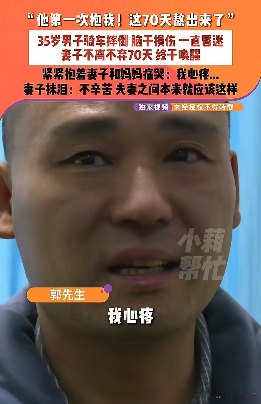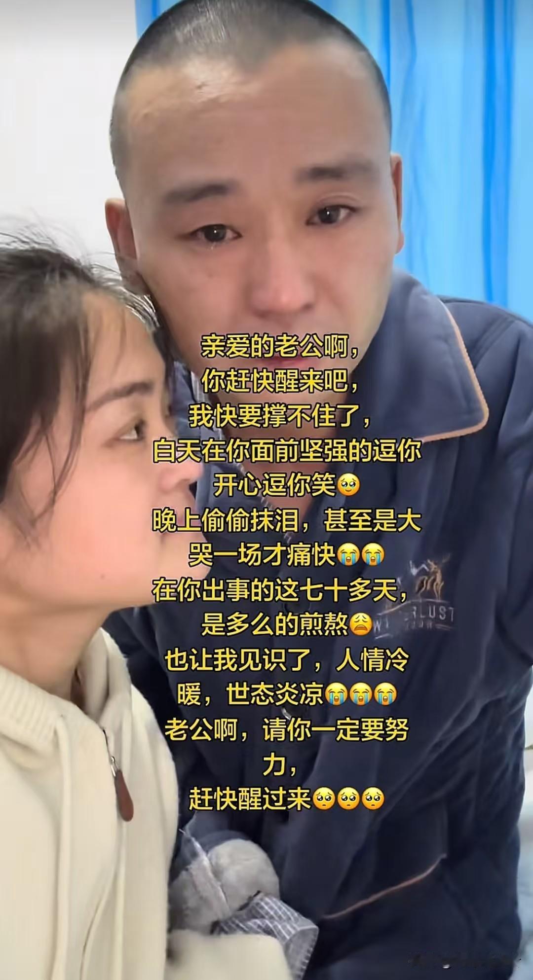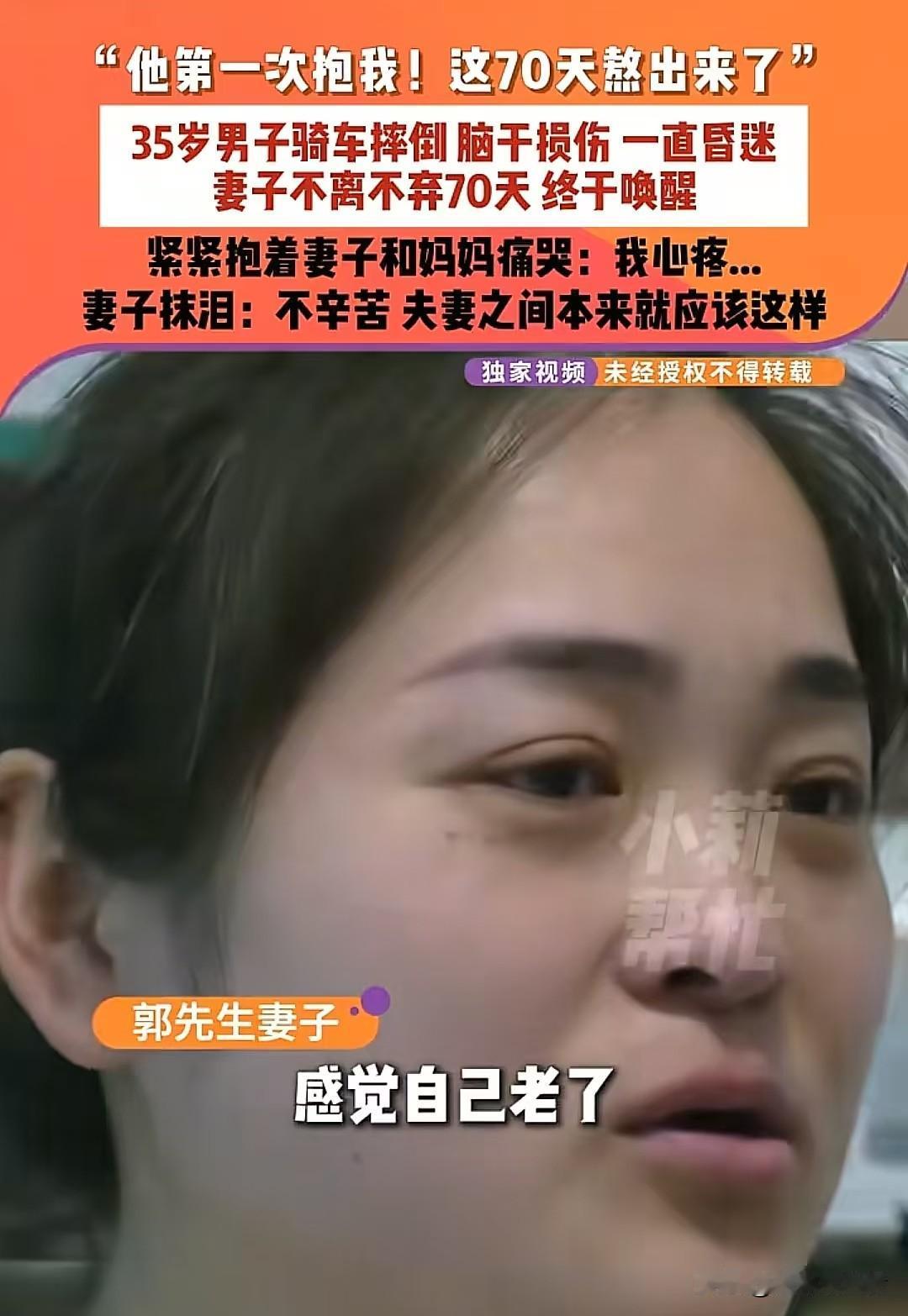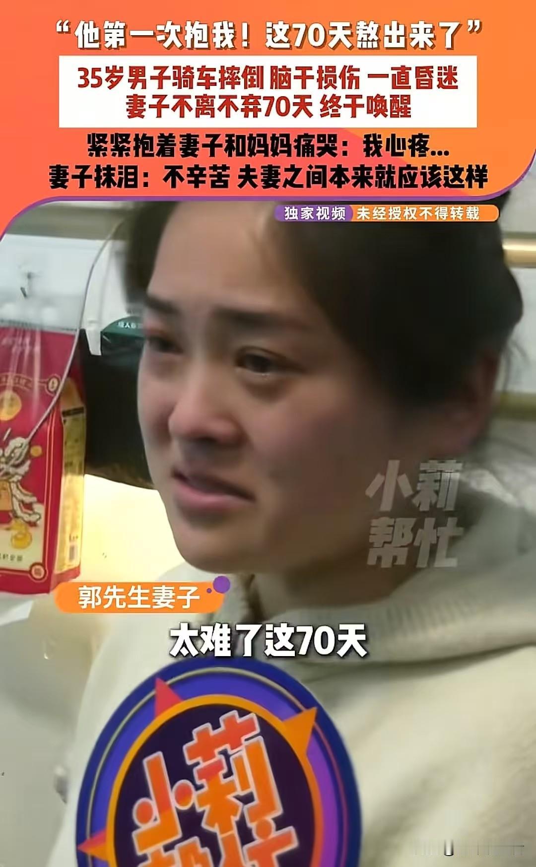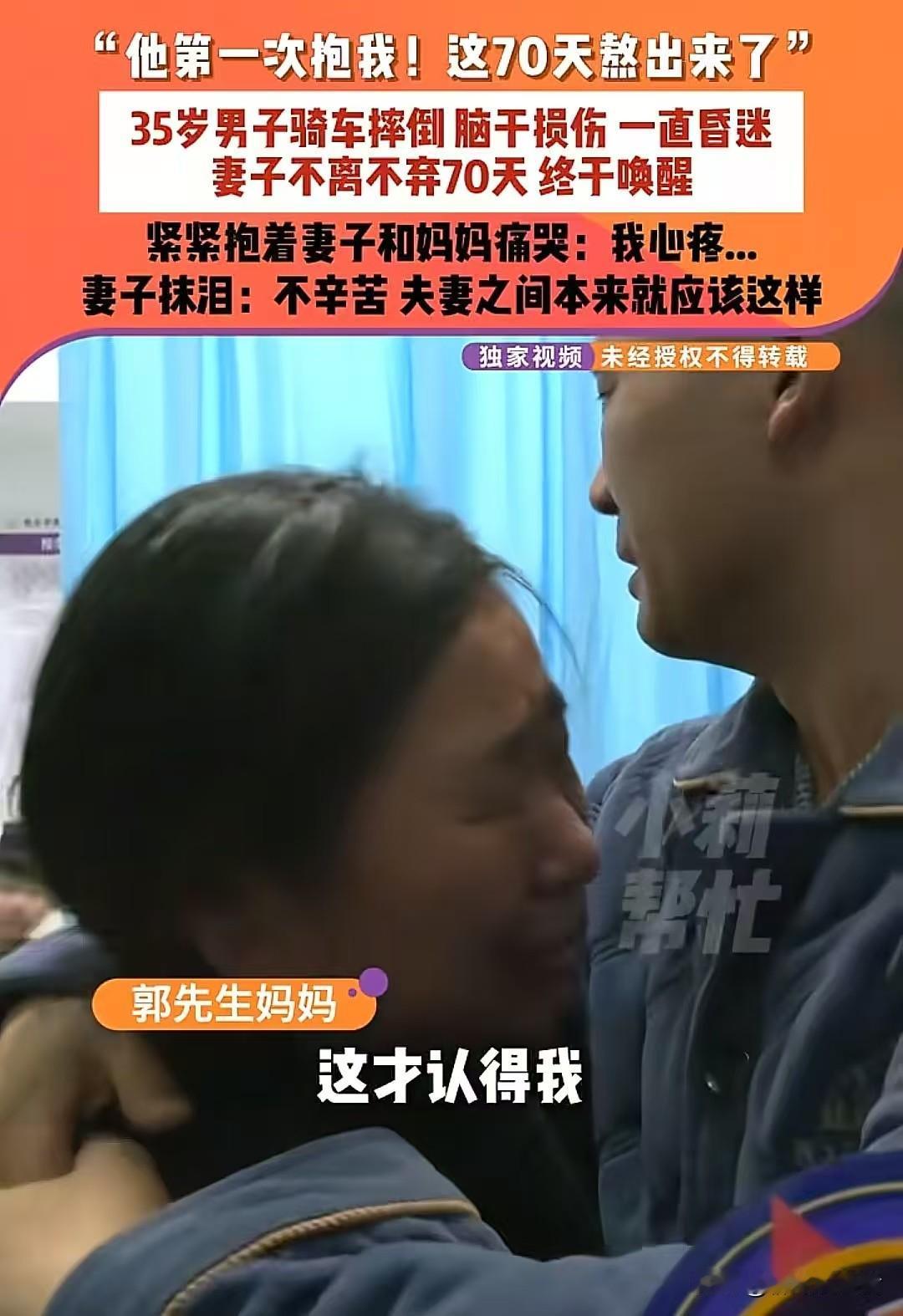 【70个日夜,1680小时的坚守!妻子用爱把丈夫从沉睡中唤醒:快过年了,我就想带他回家】 “医生摇头说他醒不过来了,可我偏不信!”河南商丘的肖女士,就凭着这句话,让多少人看了都忍不住掉眼泪。35岁的丈夫意外从高处摔下来,导致脑干严重受伤,医生直接下了“苏醒没希望”的结论。她却没放弃,就这么守了70天,日夜没合眼——每天给他擦身、喂饭,还跟他说家里的琐事,甚至把孩子平时咯咯笑的声音录下来,天天放给他听。直到有一天,丈夫的手终于微微颤抖着抱住了她,熬得头发都白了大半的她,笑着抹了抹眼泪说:“能回家就好!” 这个春节前,最让人心里发酸又温暖的故事里,藏着爱情最实在的答案——说白了,夫妻就是在对方最难的时候,心里想着“本来就该这样守着”。有人问她:“这样守着,到底值不值啊?”你看她给丈夫穿红袜子时微微颤抖的手,看他那双慢慢睁开的眼睛,这就是最好的答案啊。 (互动:你身边有没有这样让人感动的相守故事?来评论区聊聊吧!) 丈夫昏迷 沉睡的丈夫