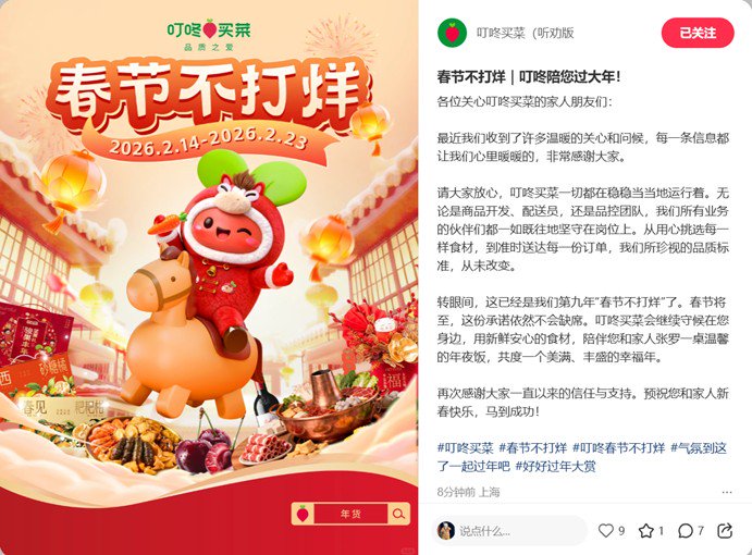 为回应广大用户关切,2月9日,叮咚买菜通过官方小红书账号发布信息称:“请大家放心,叮咚买菜一切都在稳稳当当地运行着。无论是商品开发、配送员,还是品控团队,我们所有业务的伙伴们都一如既往地坚守在岗位上。从用心挑选每一样食材,到准时送达每一份订单,我们所珍视的品质标准,从未改变。”