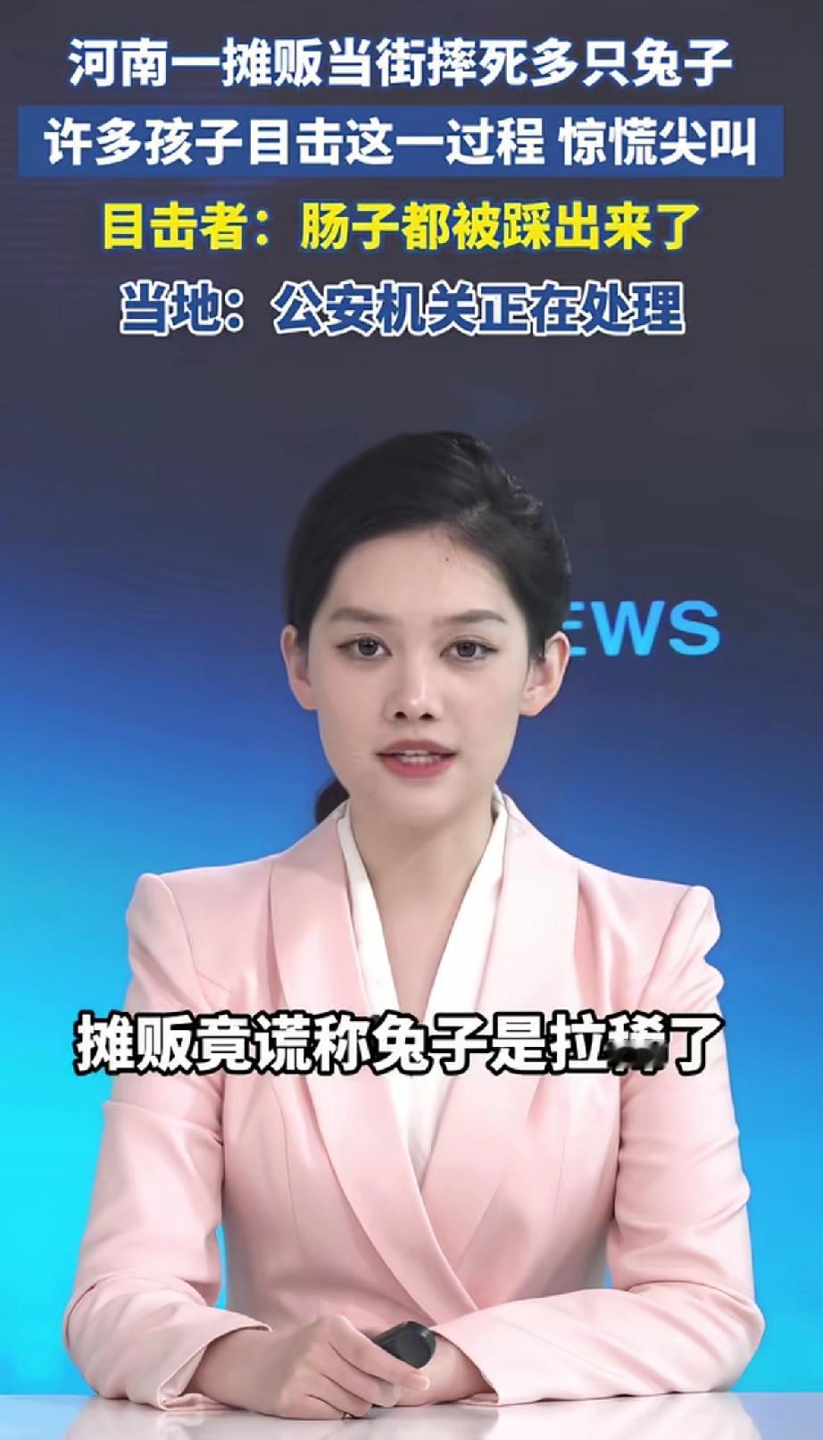 河南一摊贩当街摔死多只兔子,许多孩子目击这一过程,惊慌尖叫!目击者:兔子幼崽肠子都被摊主踩出来了。 2月8日晚,河南漯河市昌建广场那一幕,真的让人无比愤怒!一个卖兔子的摊贩,当街摔死多只兔子,兔子的肠子都被踩了出来,场面血腥又残忍。好多孩子目睹这场景,吓得惊慌尖叫。 目击者吴先生看不下去报了警,民警来警告教育,这摊贩竟谎称兔子是拉稀死掉的,民警一走,他还变本加厉继续虐兔。 这摊主就是变态心理,典型的恃强凌弱,视弱者的生命如草芥。 吴先生又报警还提供证据,当晚摊贩被带回派出所。截至2月9日,案件还在处理。 这种漠视生命、公然挑战公序良俗的行为,必须严惩,给大众一个交代!