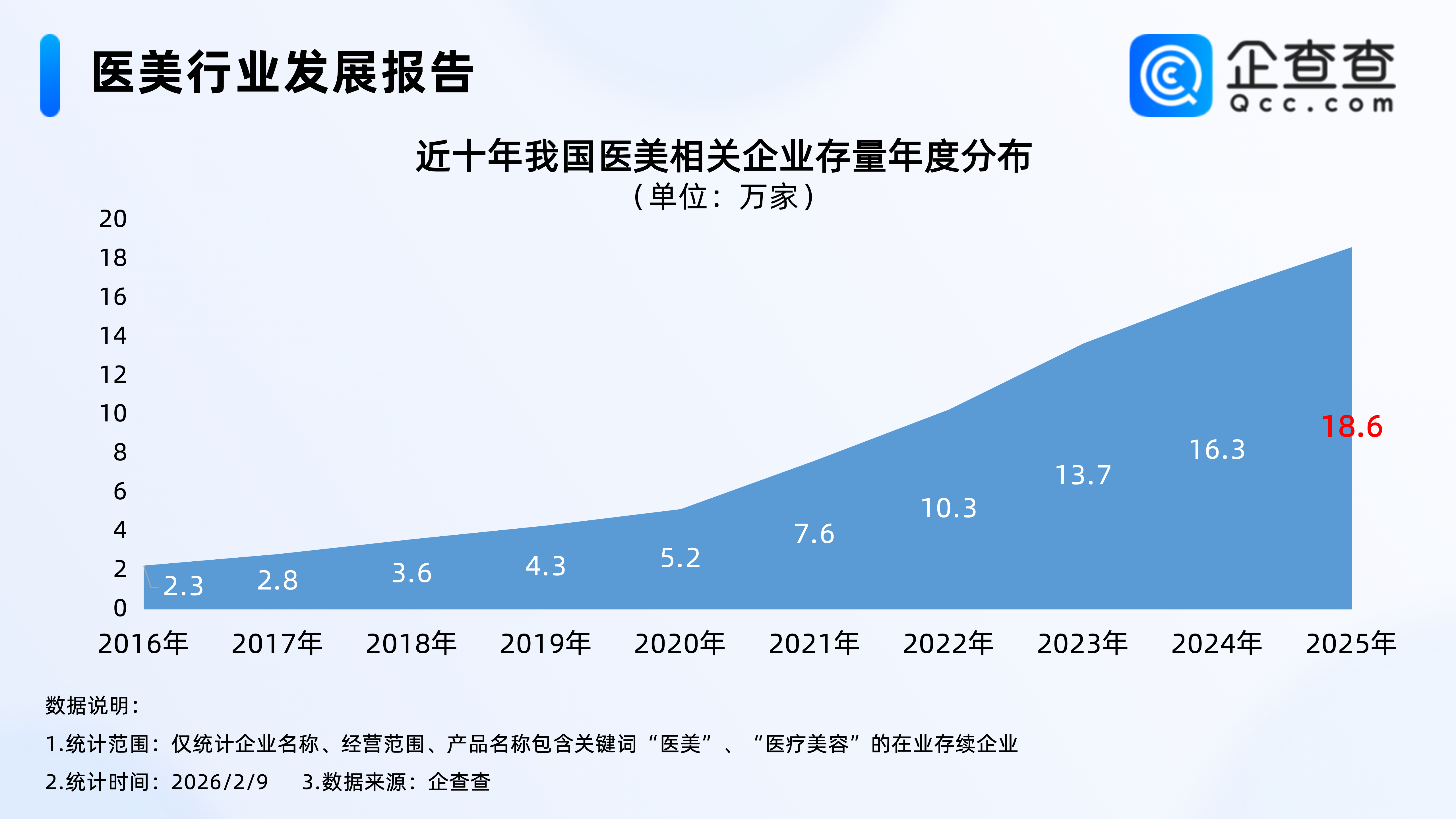 企查查数据显示,近十年,我国医美相关企业存量逐年增加,其中2020年至2023年存量增速相对最快,2025年年底,我国在业存续18.6万家医美相关企业。截至2026年2月9日,我国现存18.8万家医美相关企业。