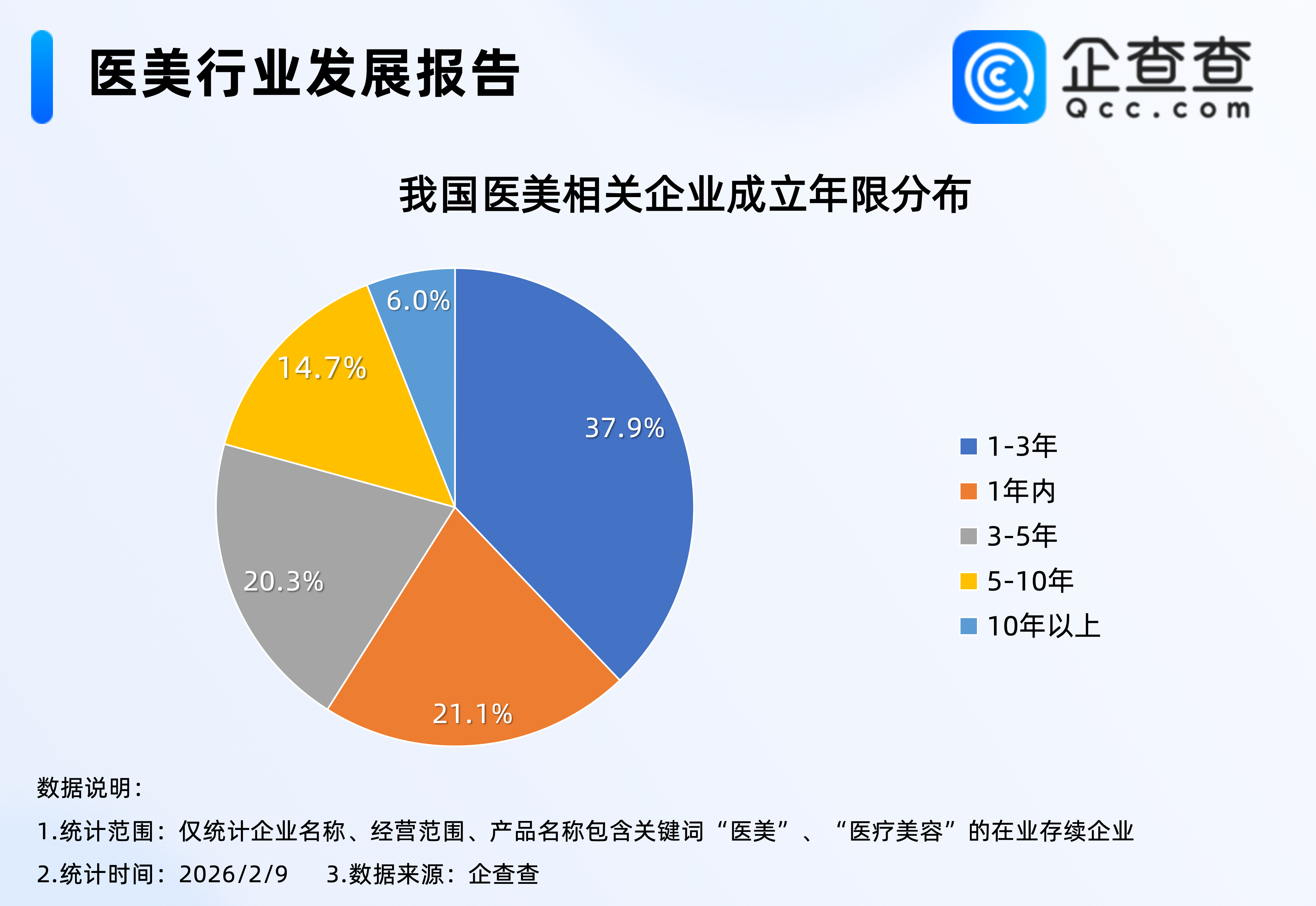 企查查数据显示,2025年全年我国累计注册4.1万家医美相关企业,区域分布上,华东地区2025年相关企业注册量最多,占比30.1%。企业存量方面,截至2026年2月9日,我国现存18.8万家医美相关企业;其中近六成医美相关企业成立于近三年,成立1至3年之间的企业最多,占比37.9%。