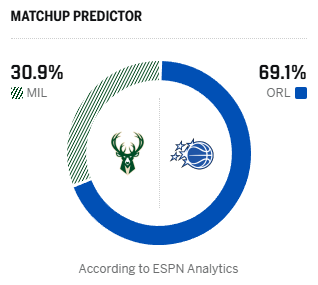 ESPN预测明日比赛:魔术胜率为69.1%,雄鹿胜率为30.9%